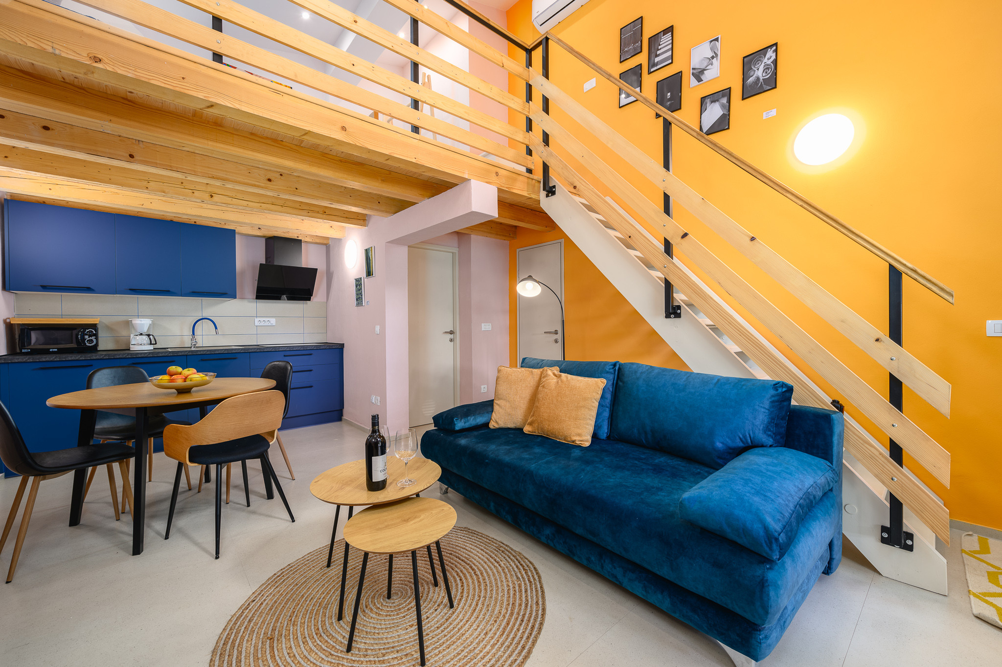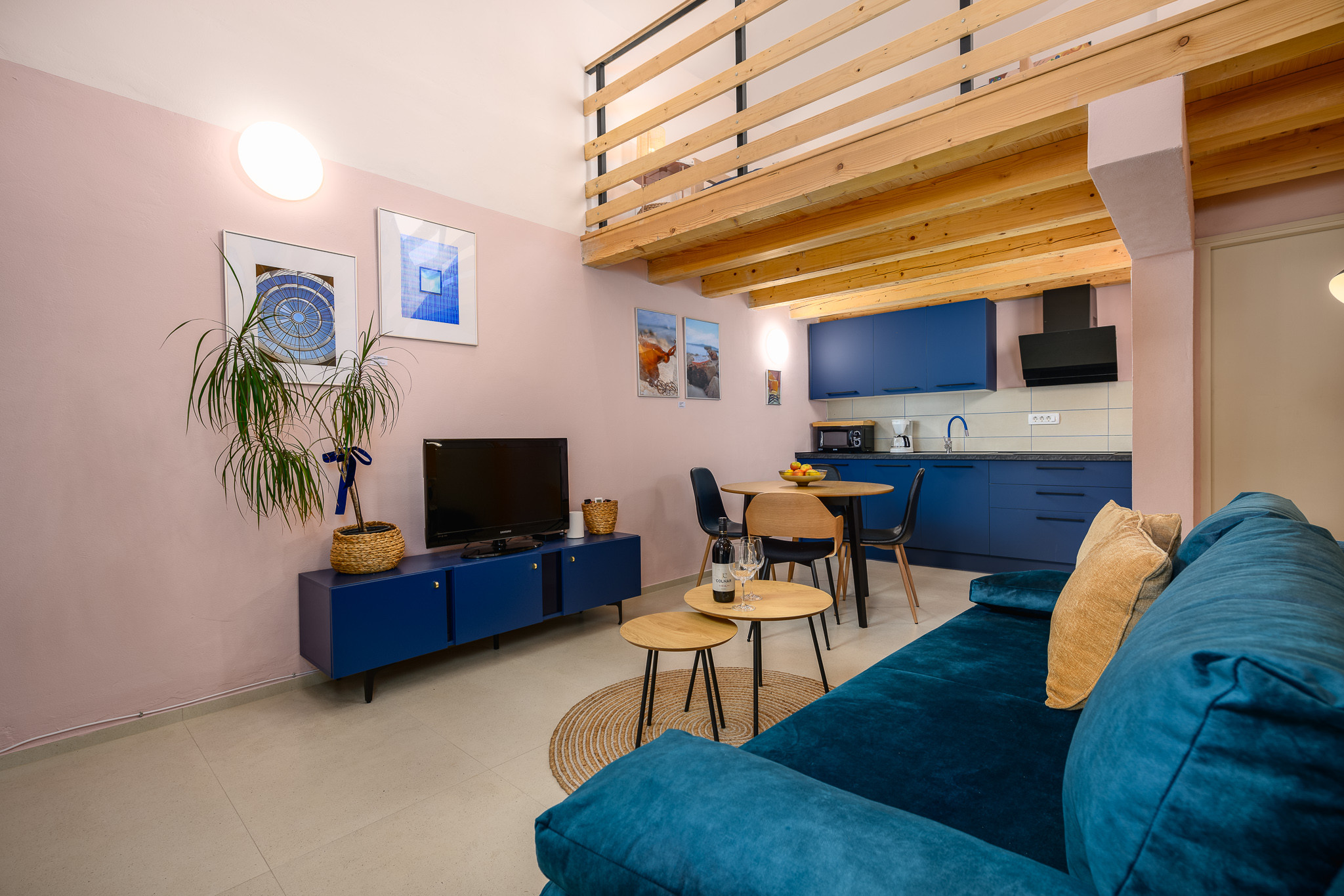 Das schöne Apartment Stella Marina in der Nähe des Meeres in Cervar Porat in der Nähe von Porec besteht aus einem Wohn- und Küchenbereich im Freien und einem Badezimmer mit Dusche im Erdgeschoss. Auf der Galerie befindet sich das Schlafzimmer mit großem Doppelbett.