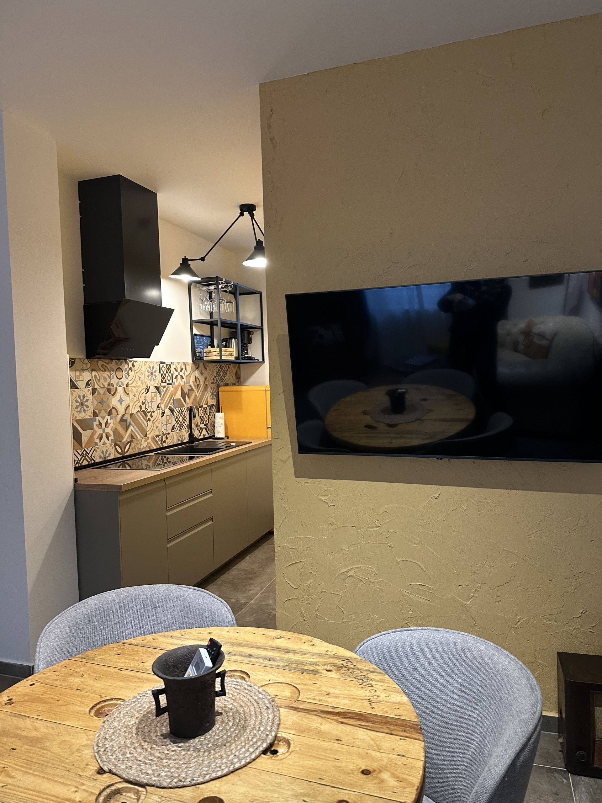 Das Apartment verfügt über eine gut ausgestattete Küche mit Kühlschrank, Kaffeemaschine und allen notwendigen Küchenutensilien, sodass Sie ganz einfach köstliche Mahlzeiten zubereiten und gemeinsam schöne Zeit verbringen können. Der Wohnbereich verfügt über ein bequemes Doppelschlafsofa, das zusätzlichen Schlafplatz für Ihre Gruppe bietet. Das Schlafzimmer ist mit einem bequemen Kingsize-Bett ausgestattet, das eine erholsame Nachtruhe garantiert.