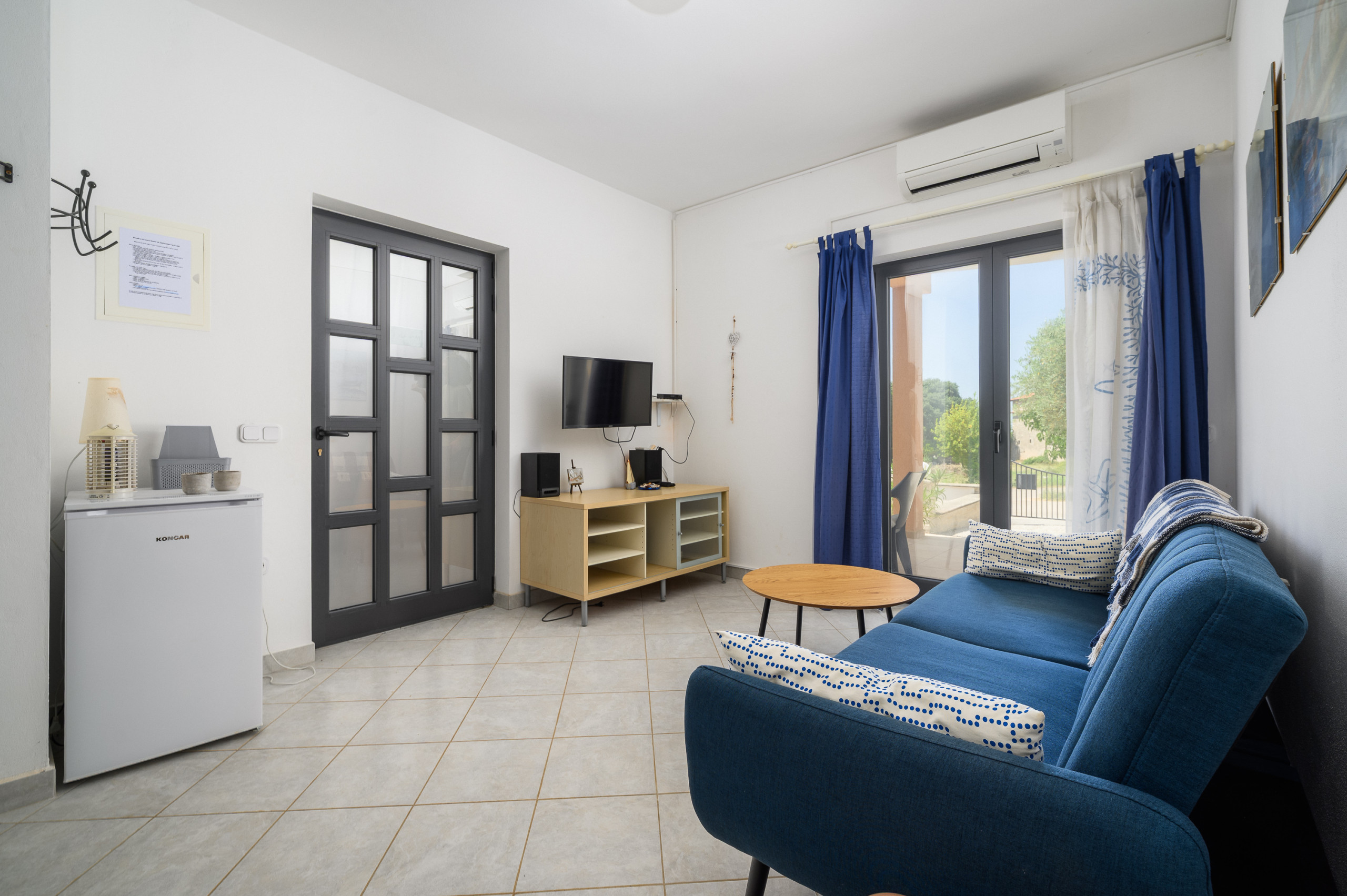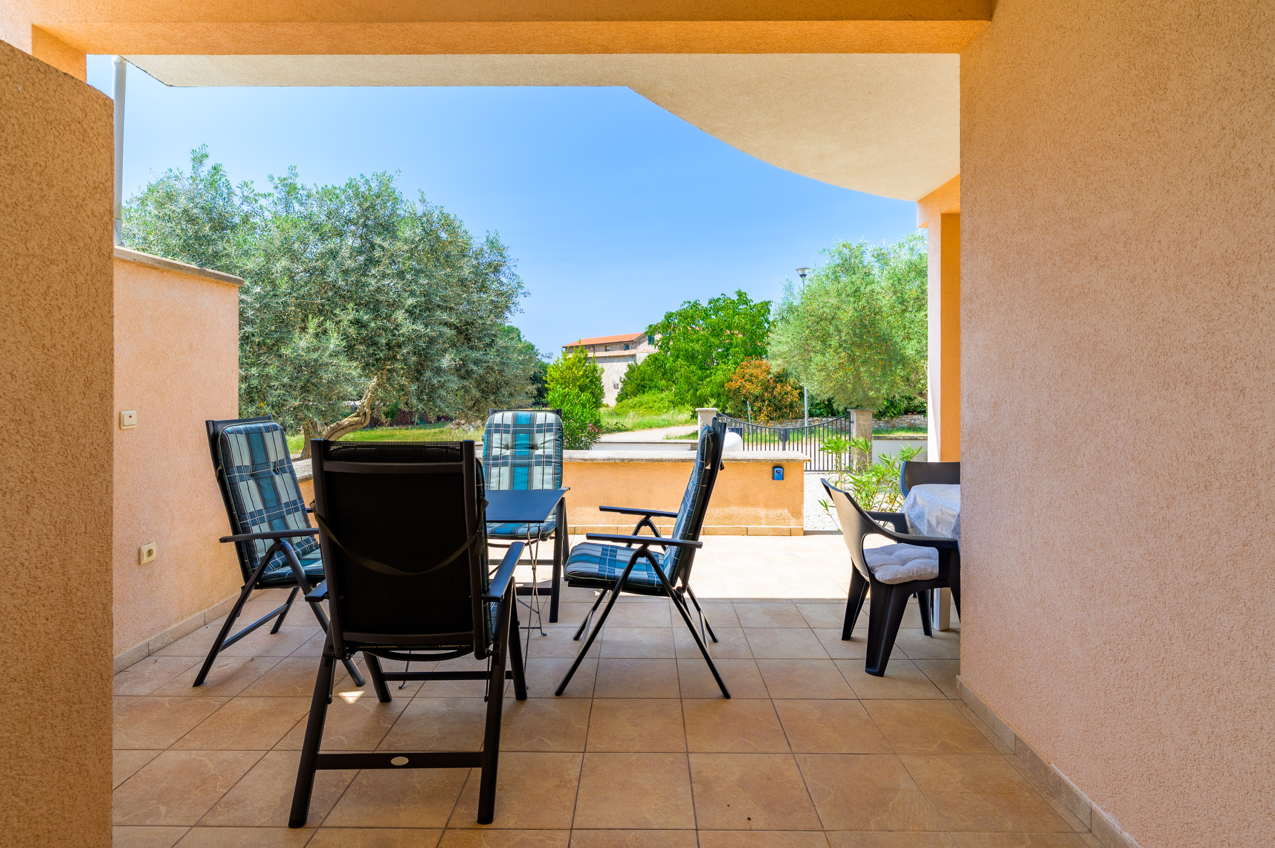 Vor der Wohnung befindet sich eine große Terrasse. An der Seite befindet sich ein Teil des Gartens mit einem Gemeinschaftspool. Der Pool wird mit dem Apartment Panous I geteilt, das sich auf der anderen Seite des Gebäudes befindet.