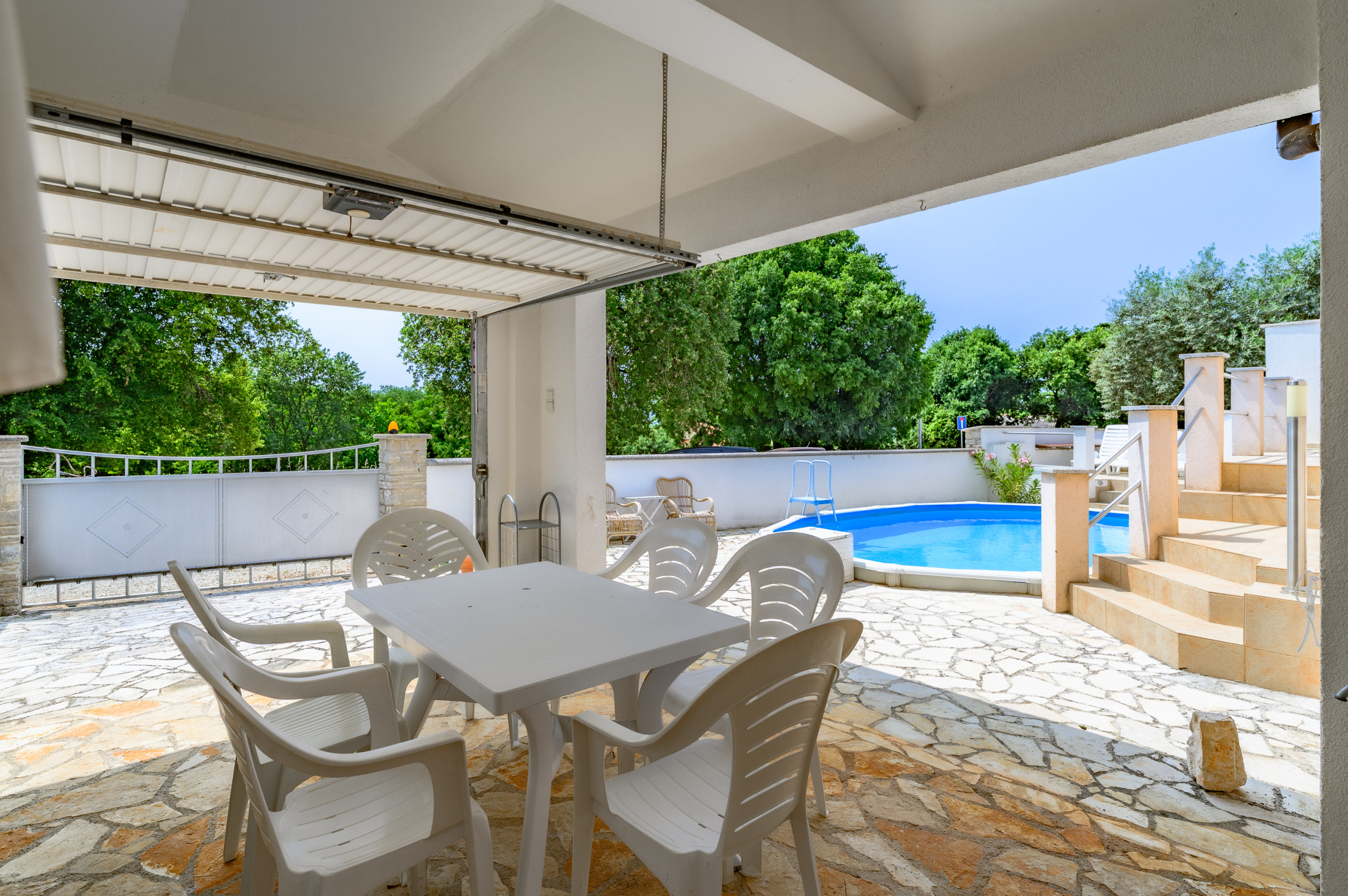 Vor der Wohnung befindet sich eine große überdachte Terrasse, ideal zum Entspannen in der Sahe. Der Garten an der Vorderseite gehört zur Wohnung und an der Seite befindet sich ein Teil des Gartens mit Gemeinschaftspool. Der Pool wird mit dem Apartment Panous II geteilt, das sich auf der anderen Seite des Gebäudes befindet.