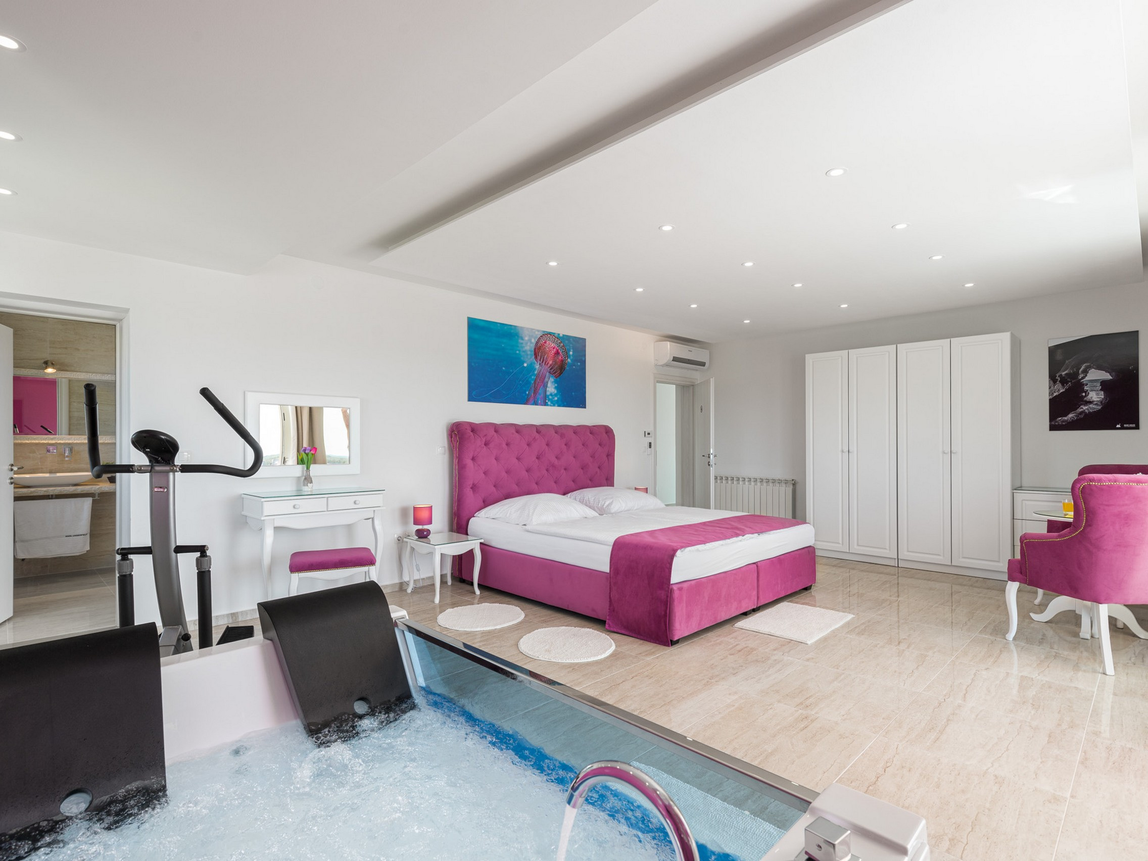 Ein Schlafzimmer verfügt über einen Whirlpool, einen kleinen Fitnessraum und eine private Sauna für ein entspannendes Erlebnis.