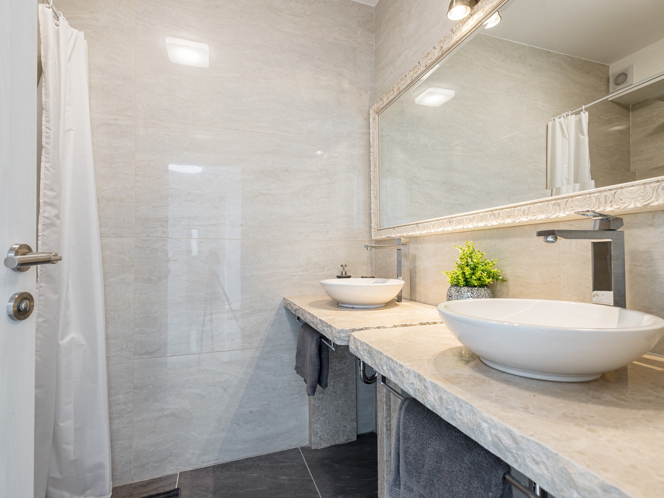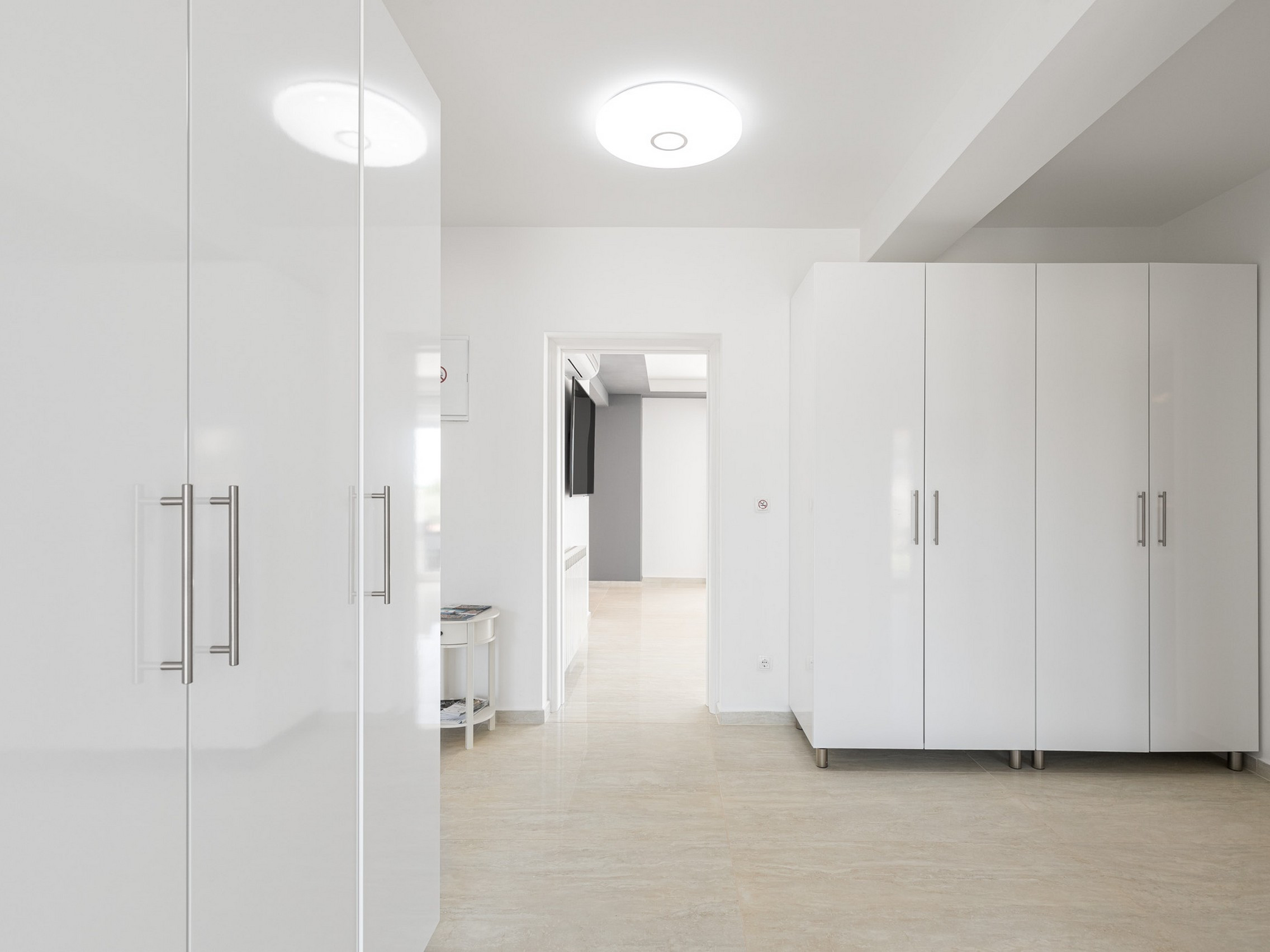 Im Erdgeschoss befindet sich ein geräumiger Wohnbereich mit Panoramablick auf den Pool und die Terrasse, ein großzügiger Essbereich und eine voll ausgestattete moderne Küche sowie zwei Doppelschlafzimmer, eines davon mit eigenem Badezimmer.