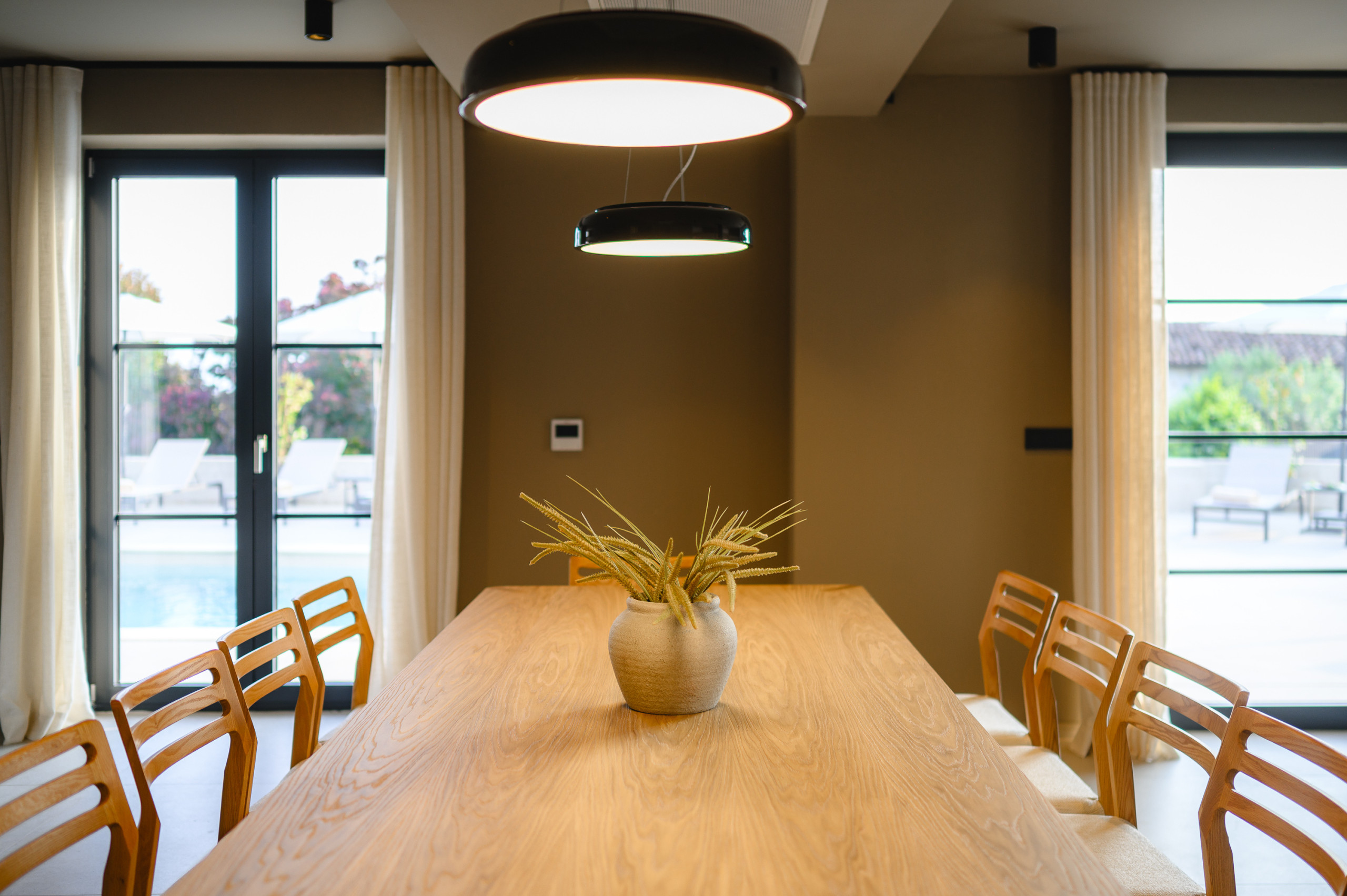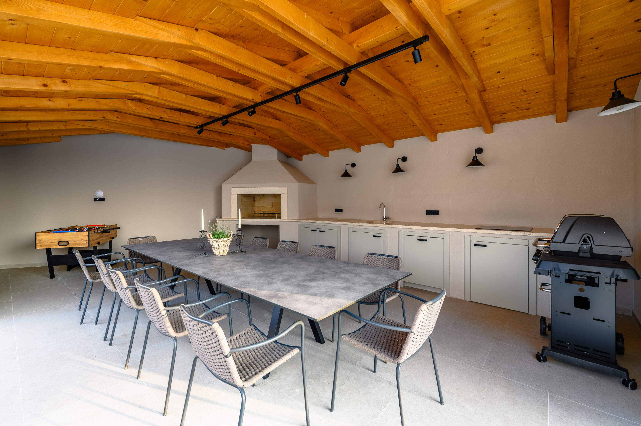 Die Villa bietet einen großen, offenen Wohn-, Ess- und Küchenbereich mit Zugang zum Garten mit großem Pool und Außenküche.