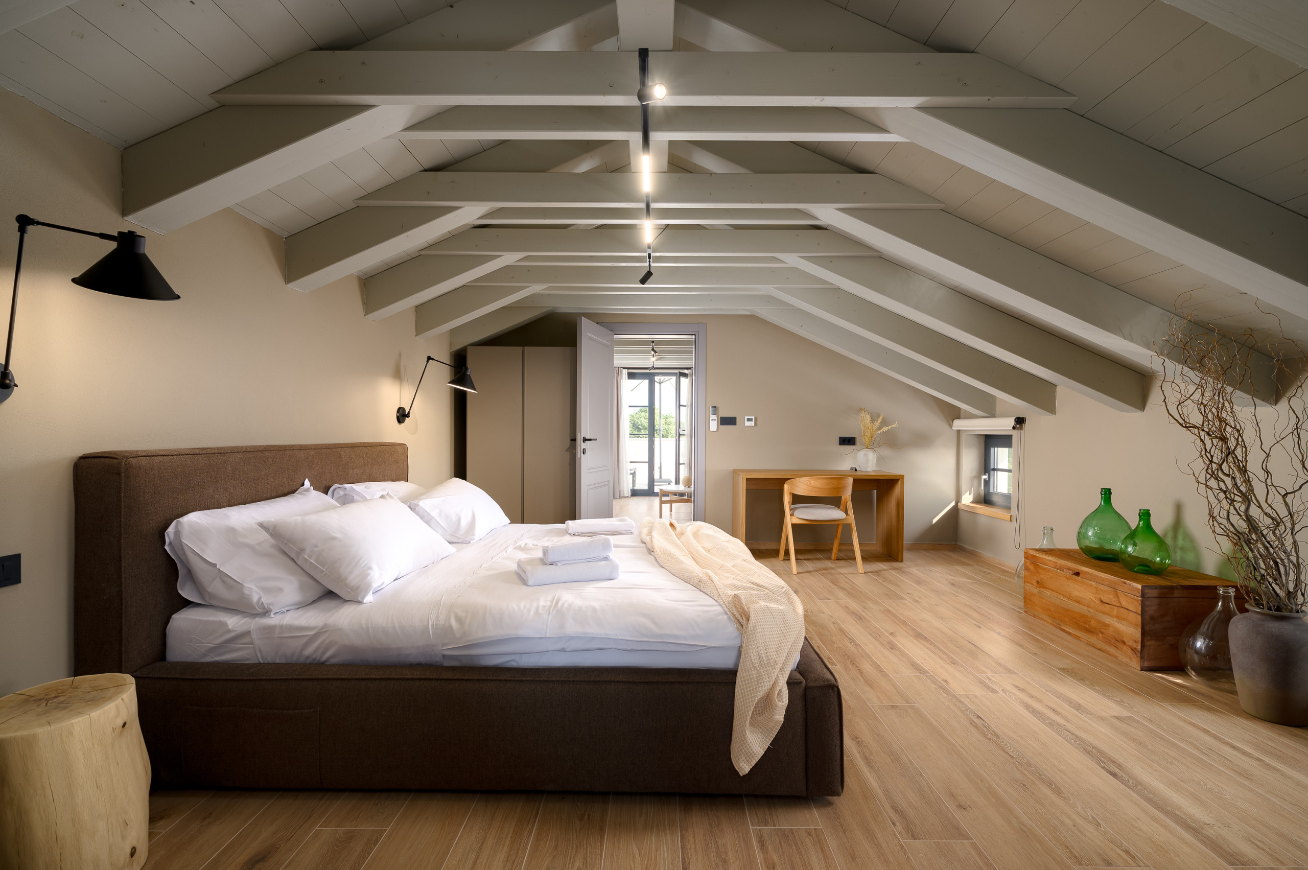 Ein Schlafzimmer mit eigenem Bad (Dusche) befindet sich im Erdgeschoss, sodass auch Gruppen von Gästen gut untergebracht werden können. Drei Schlafzimmer mit eigenem Bad (Dusche) befinden sich im ersten Stock, und im zweiten Stock befindet sich ein Hauptschlafzimmer mit großem Bad mit Badewanne.