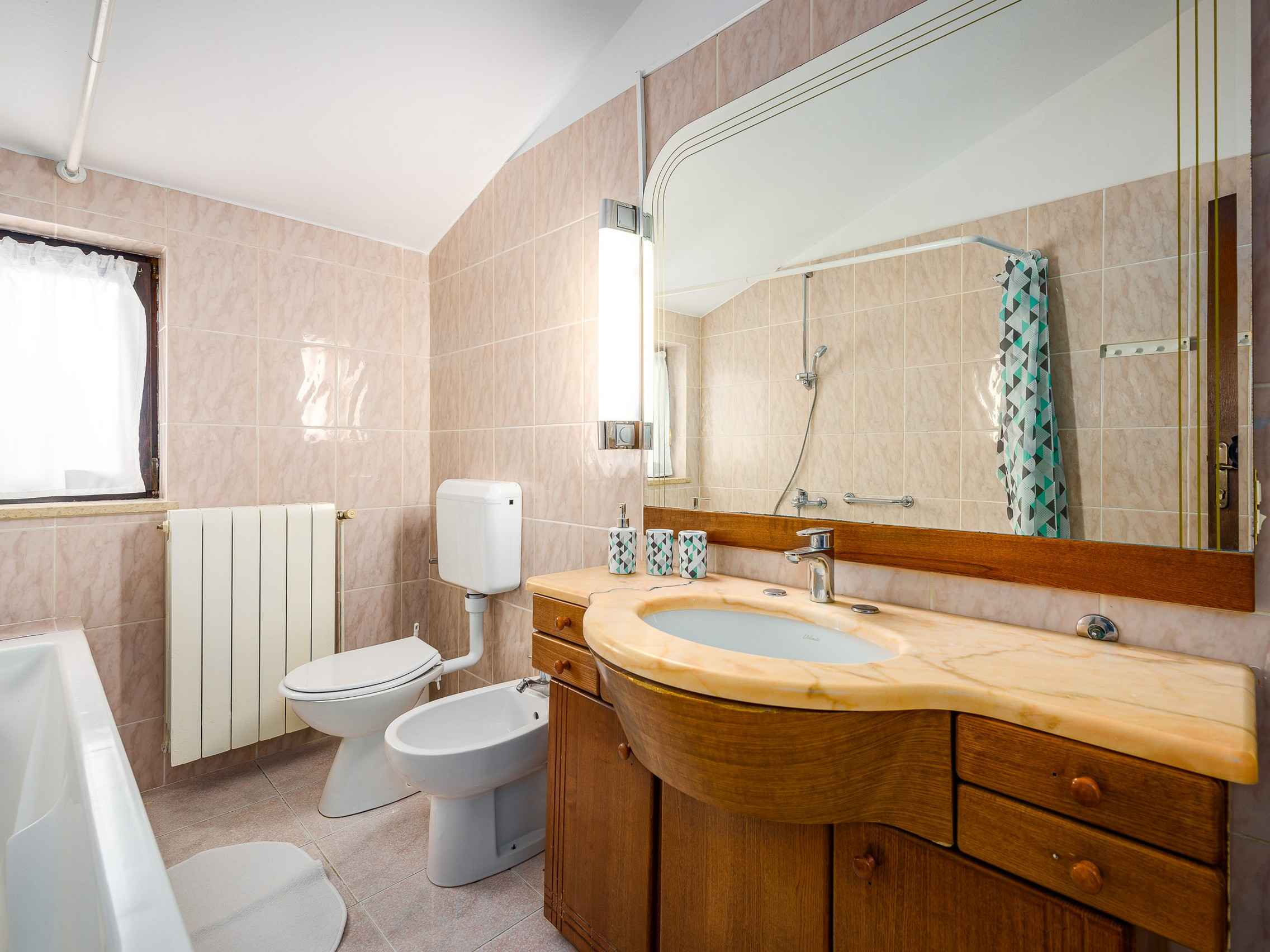 Im Obergeschoss befinden sich 2 Schlafzimmer mit Doppelbett und ein Schlafzimmer mit zwei Einzelbetten sowie ein weiteres Badezimmer mit Badewanne.