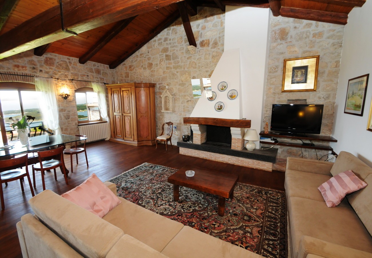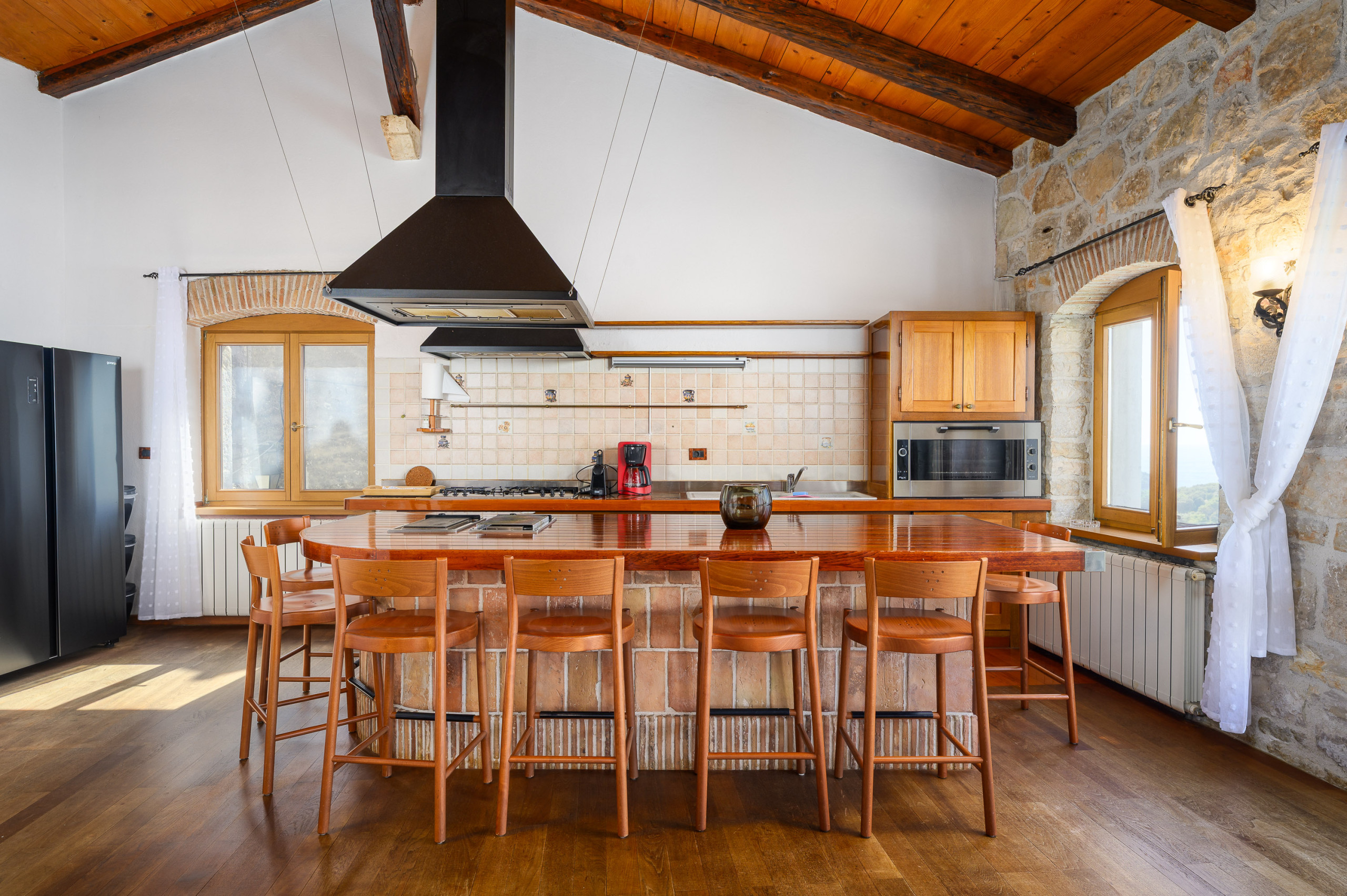 Im Obergeschoss befindet sich ein großzügiger, offener Wohnbereich mit einem weiteren Kamin und einer voll ausgestatteten Küche. Große Fenster lassen viel Tageslicht herein und bieten einen herrlichen Meerblick über den Vrsar-Archipel. Das Wohnzimmer ist klimatisiert und verfügt über ein ausziehbares Sofa, das zusätzlichen Schlafplatz für zwei Gäste bietet.