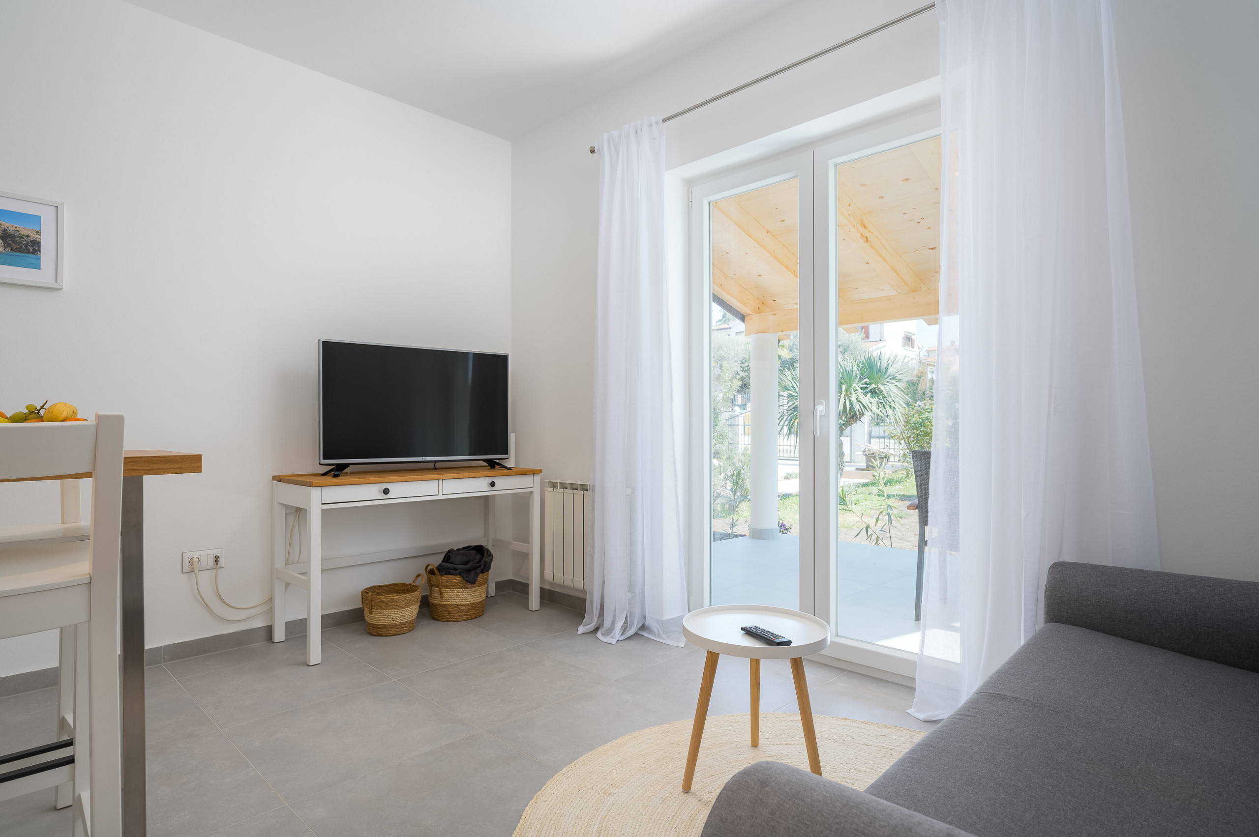 Si trova al piano terra dell'incantevole Vllla Lavanda con piscina. Si compone di una camera da letto con letto matrimoniale, bagno moderno con doccia, cucina, soggiorno, zona pranzo che si apre su un ampio terrazzo con vista sul giardino. Il divano letto nel soggiorno è estensibile, dimensioni 120 x 190 m per un altro adulto o due bambini più piccoli.