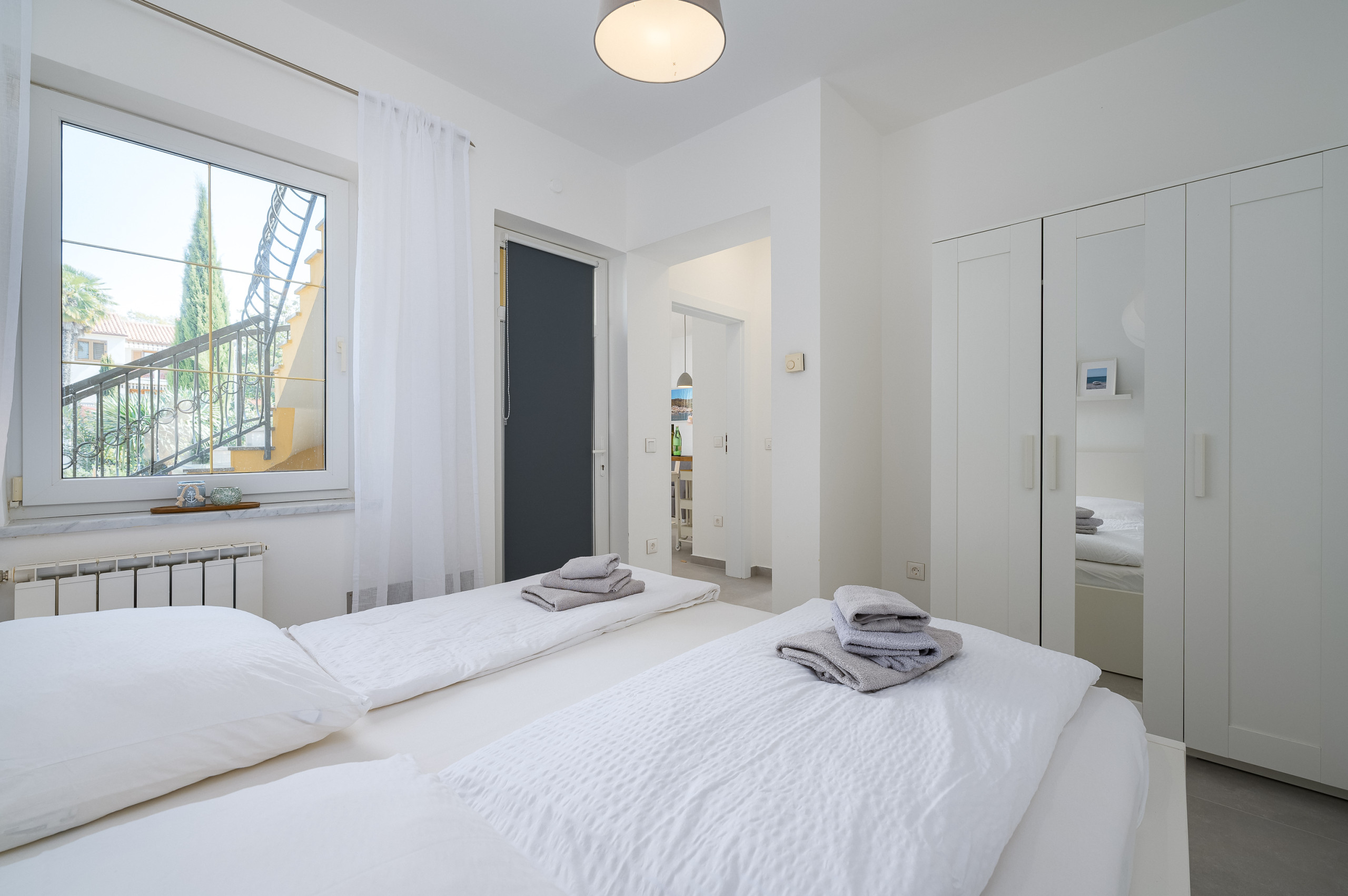 Si trova al primo piano dell'incantevole Villa Lavanda con piscina. Si compone di una camera da letto con letto matrimoniale, bagno moderno con doccia, cucina, soggiorno, zona pranzo che si apre su un ampio balcone con vista sulla piscina e sul mare.Il divano letto nel soggiorno è estensibile, misura 120 x 190 m per un altro adulto o due bambini piccoli.