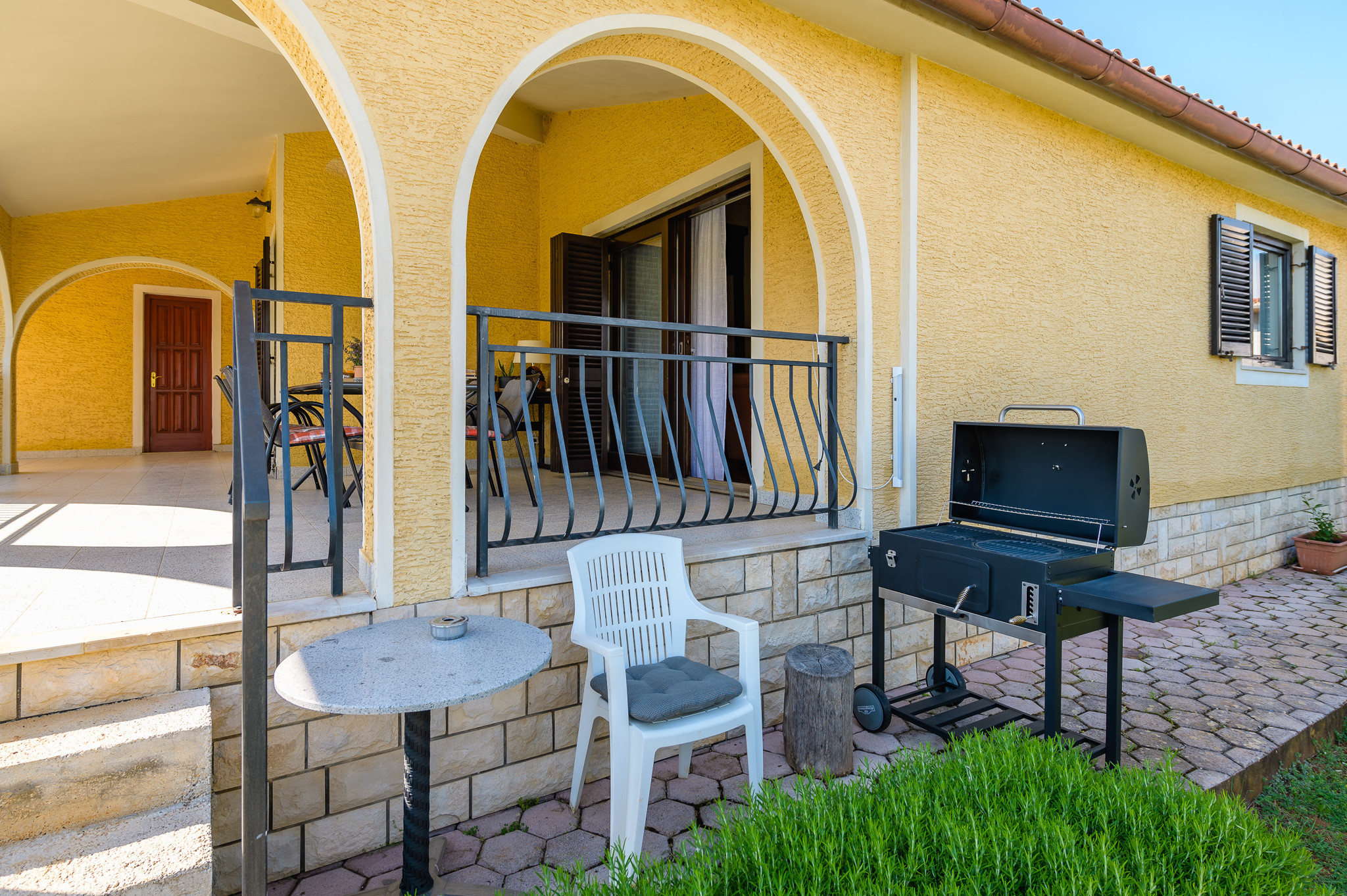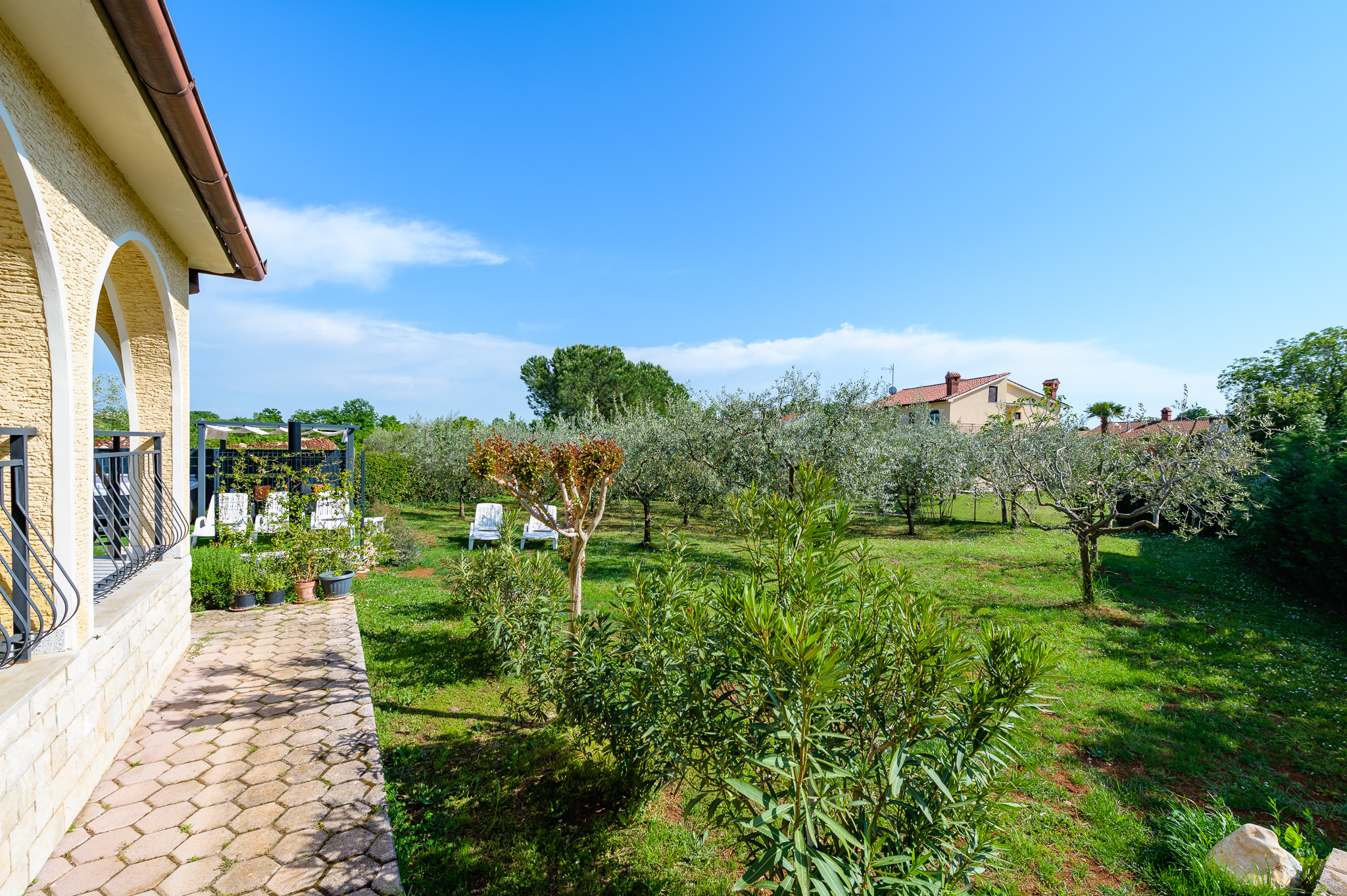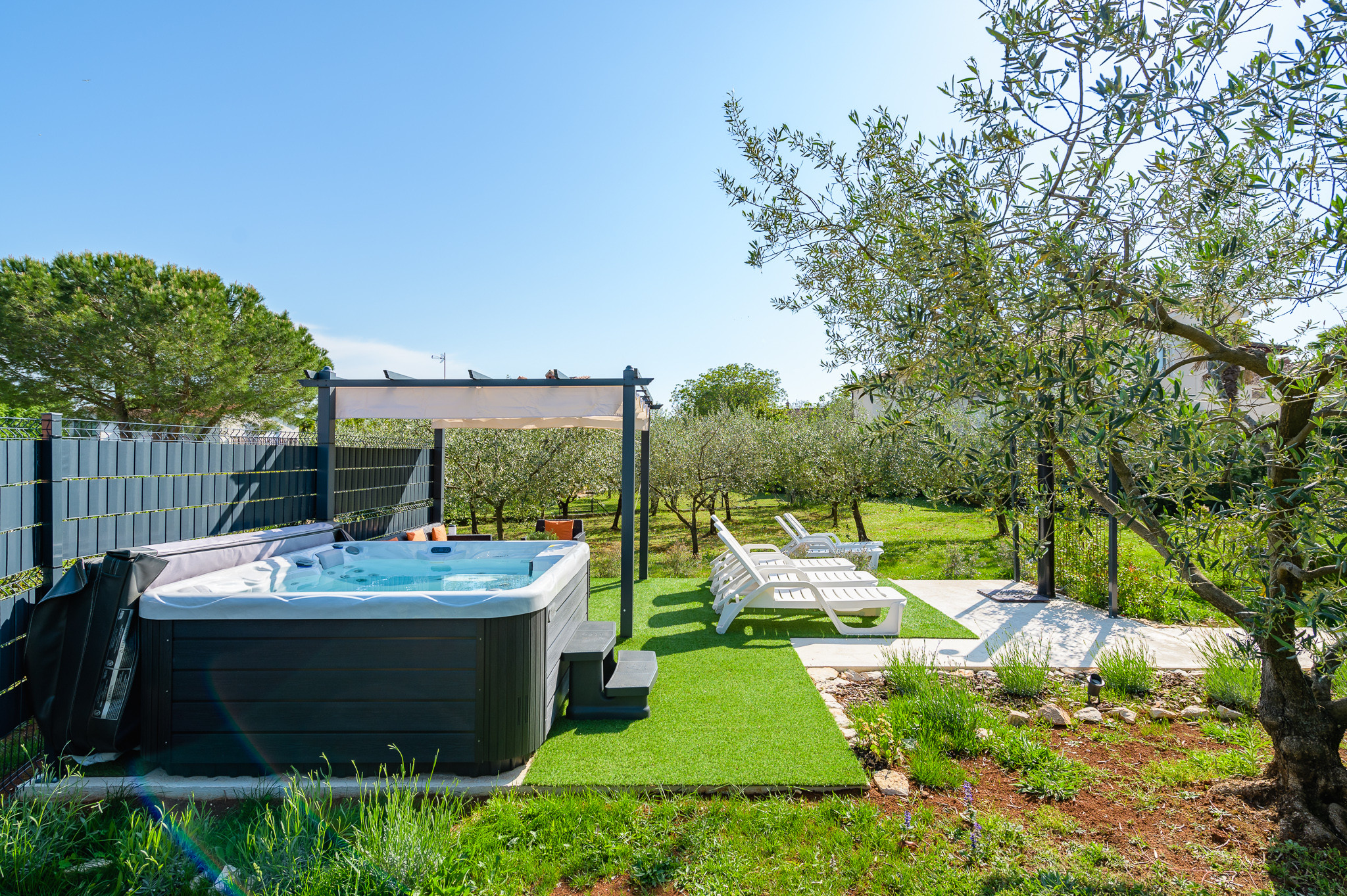 Cucina e sala da pranzo: goditi una cucina completamente attrezzata con fornello a gas, frigorifero, lavatrice, macchina per il caffè, forno e lavastoviglie, perfetta per preparare pasti da gustare nell'accogliente sala da pranzo o all'aperto sulla terrazza. Servizi all'aperto: la proprietà vanta un ampio giardino con idromassaggio e mobili da esterno, un barbecue e un'area recintata e sicura per i bambini, rendendola ideale per riunioni di famiglia e cene all'aperto.