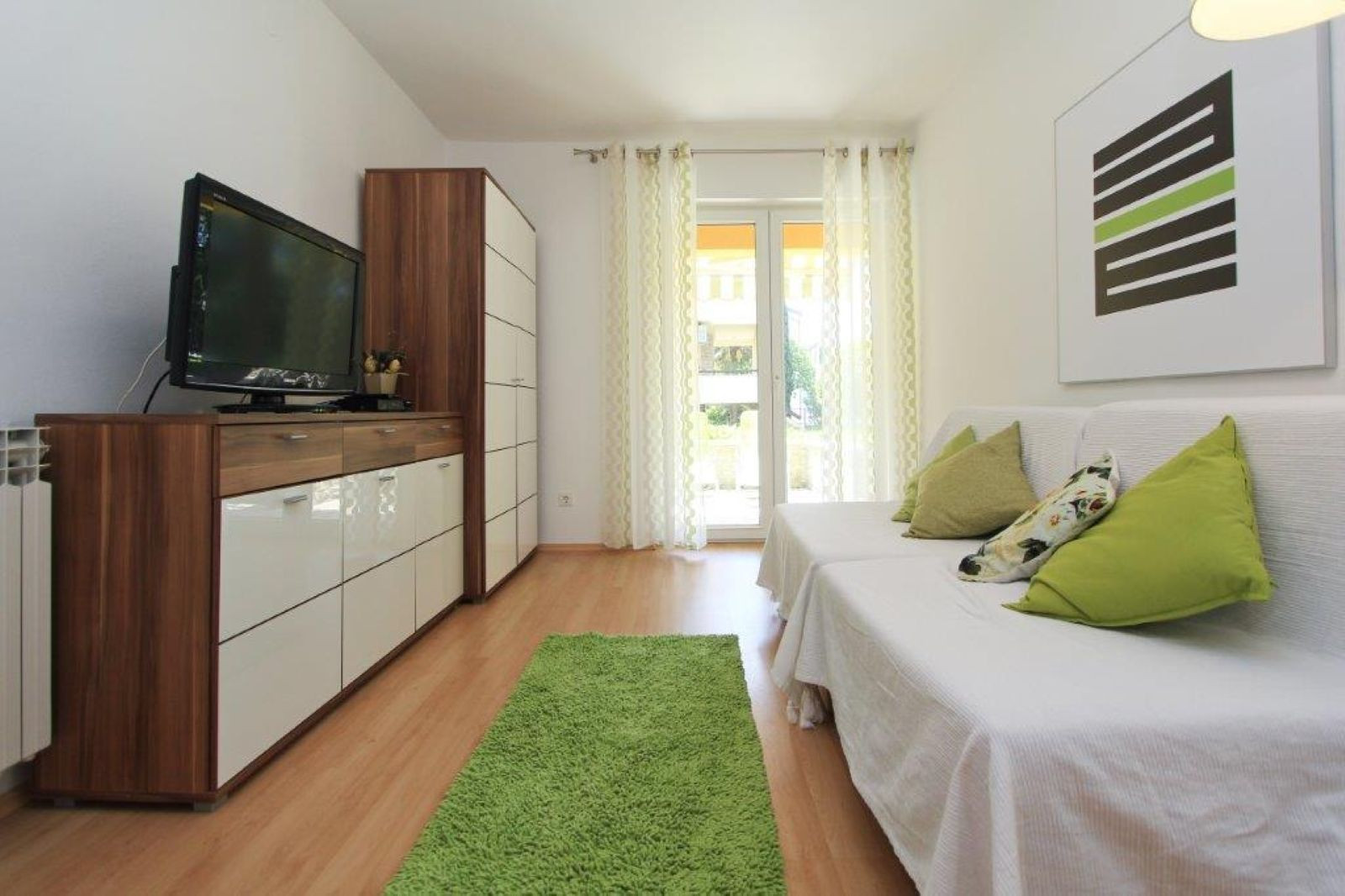 L'appartamento dispone di una confortevole camera da letto con letto matrimoniale e di un divano letto matrimoniale nella zona giorno, offrendo uno spazio accogliente e pratico per rilassarsi.