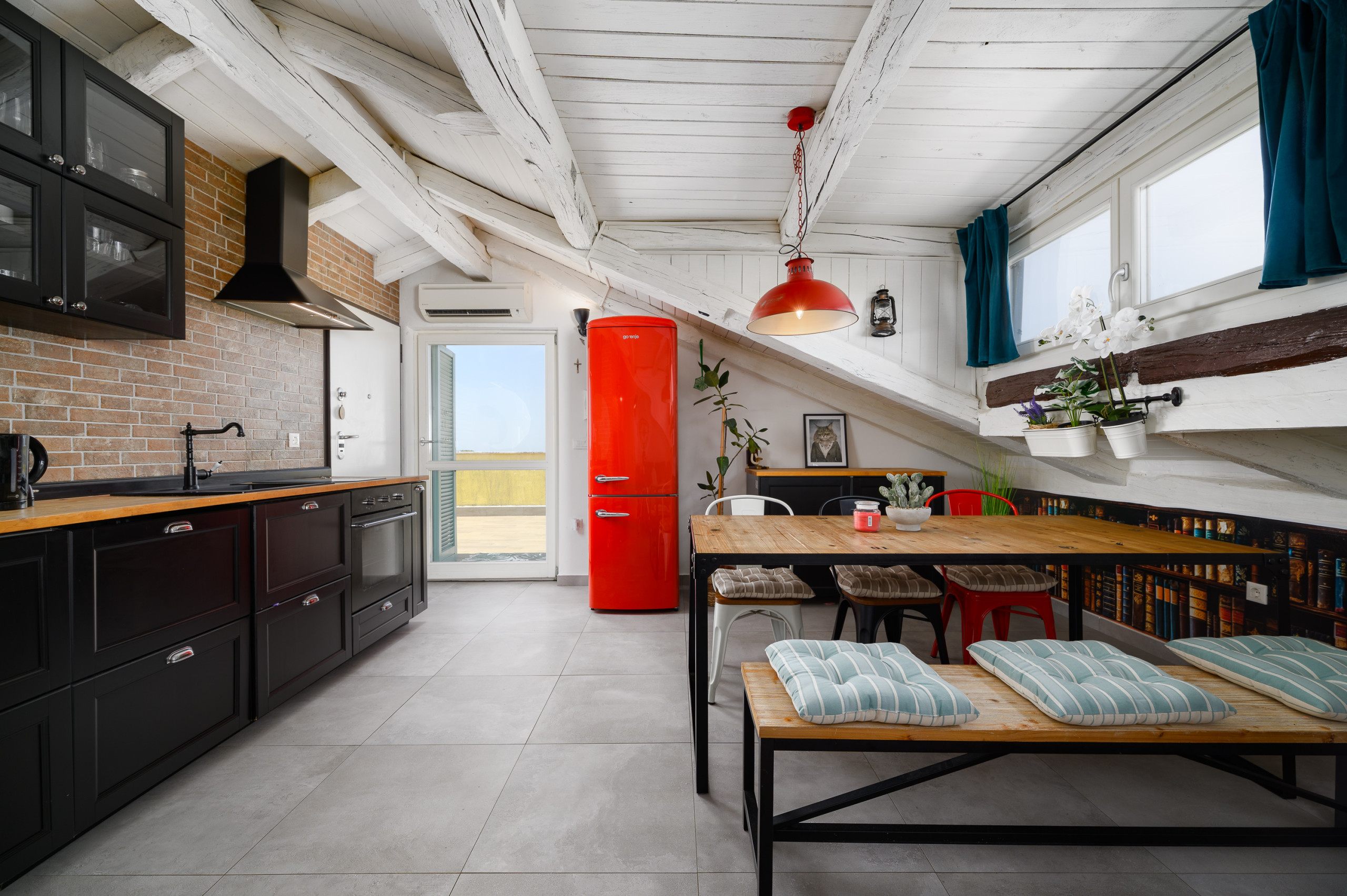 Nel piano cottura in vetroceramica della cucina open space, sono disponibili frigorifero, microonde, stoviglie, tostapane e bollitore.