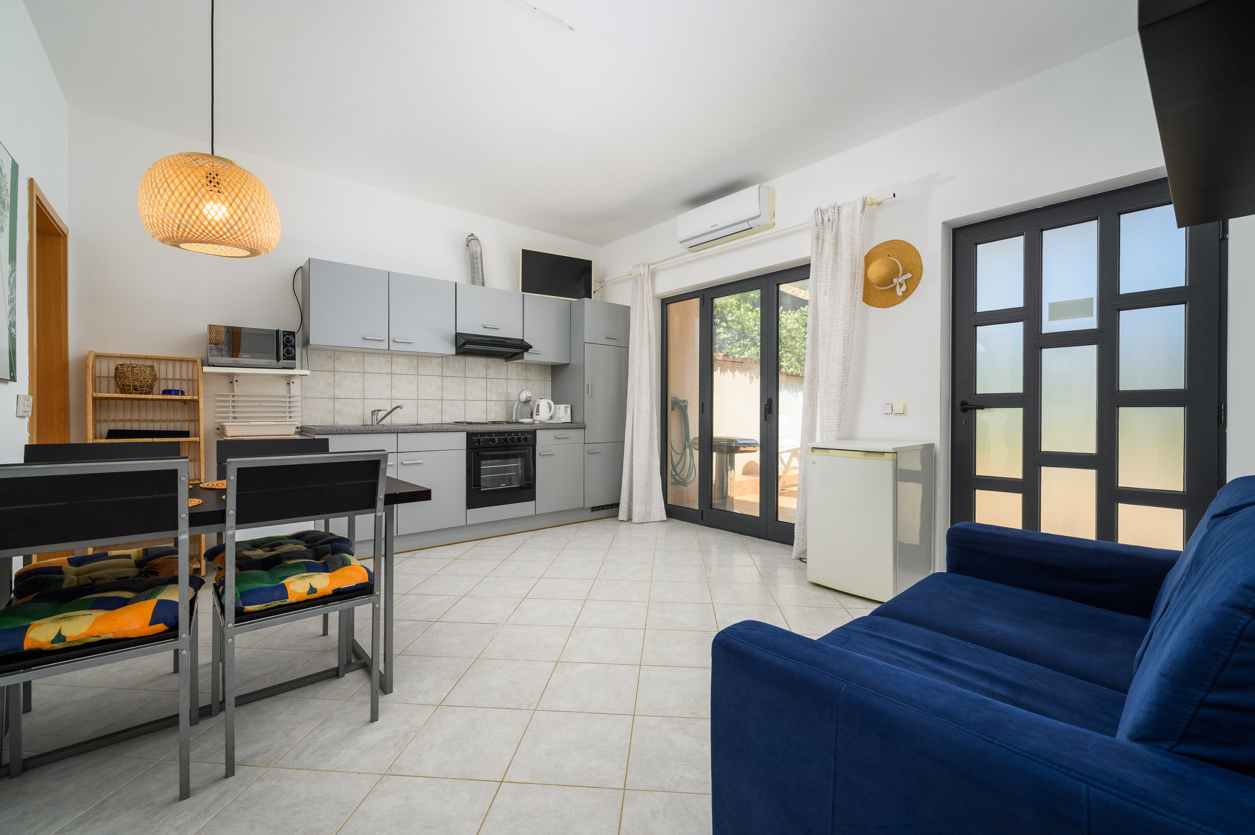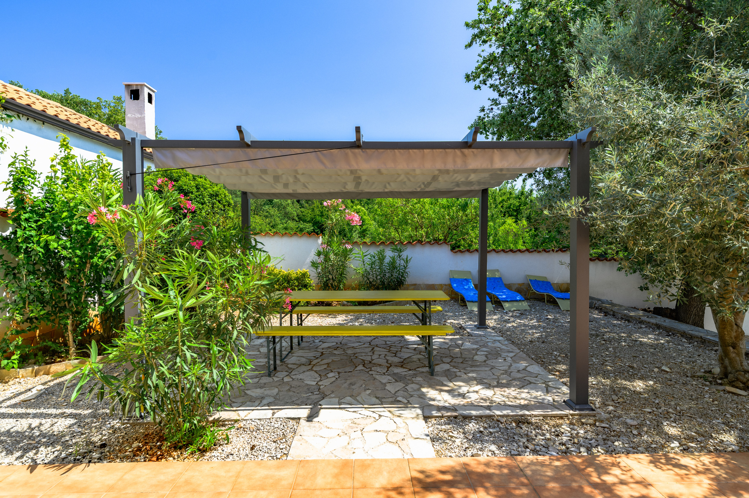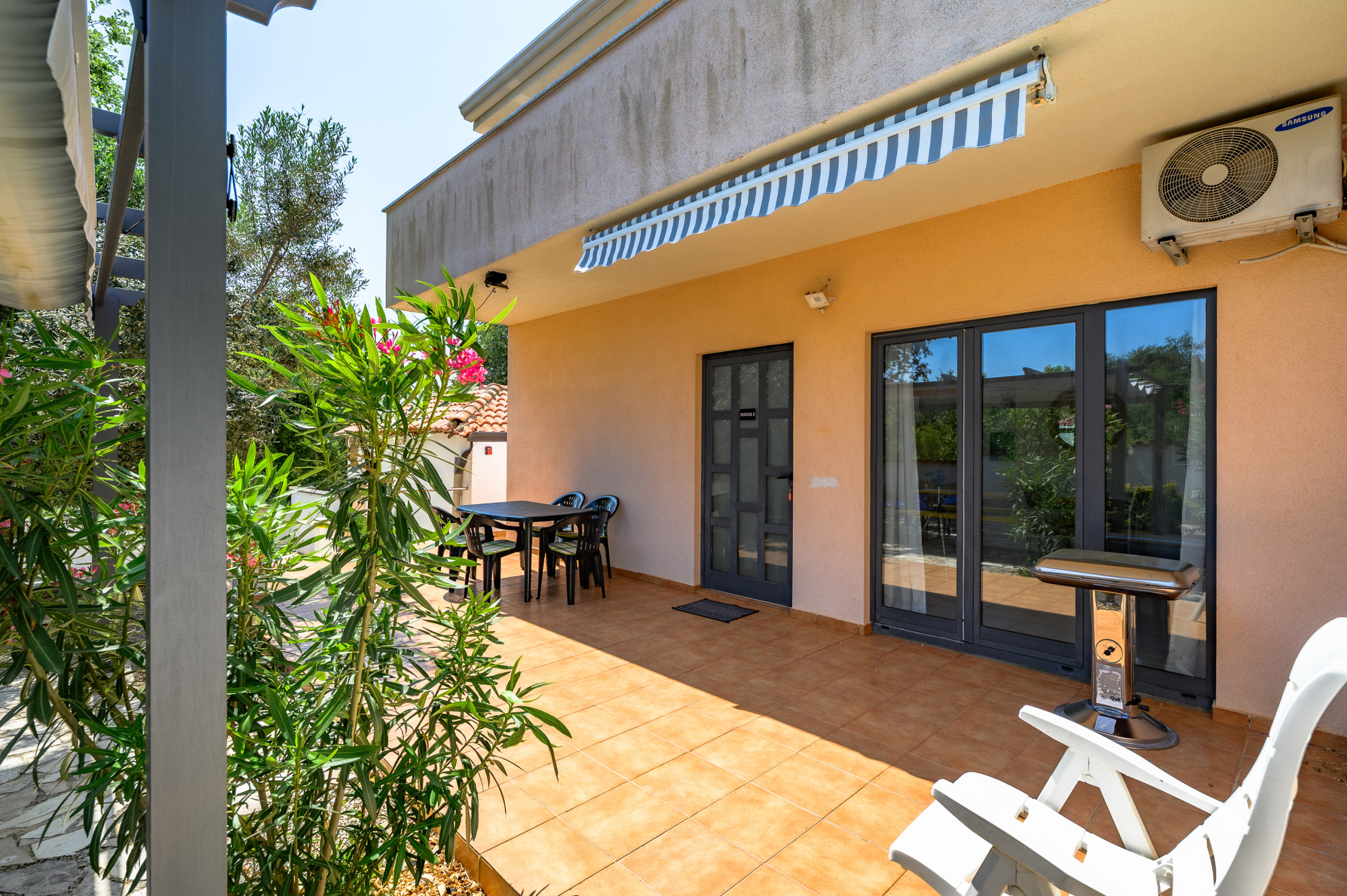 Davanti all'appartamento c'è un ampio terrazzo coperto, perfetto per rilassarsi nel sahe. Il giardino antistante è di pertinenza dell'appartamento e lateralmente si trova una parte di giardino con piscina in comune. La piscina è condivisa con l'appartamento Panous II che si trova dall'altra parte dell'edificio.