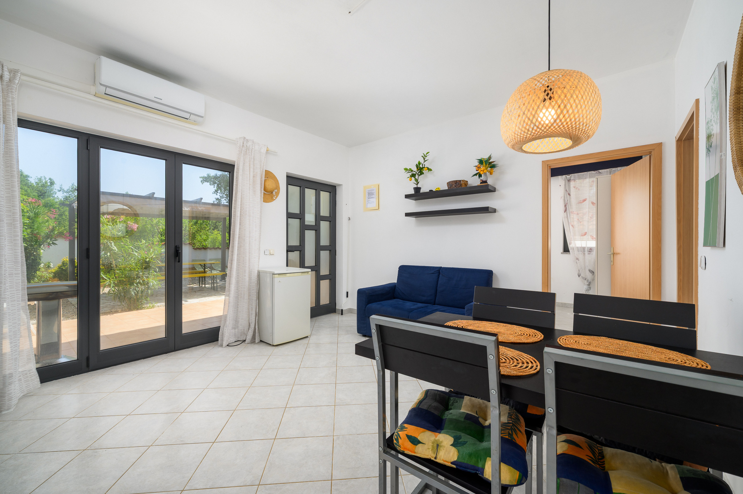 Si compone di un soggiorno, sala da pranzo, angolo cottura, un bagno con doccia e due camere da letto, una con letto matrimoniale e l'altra con due letti singoli.