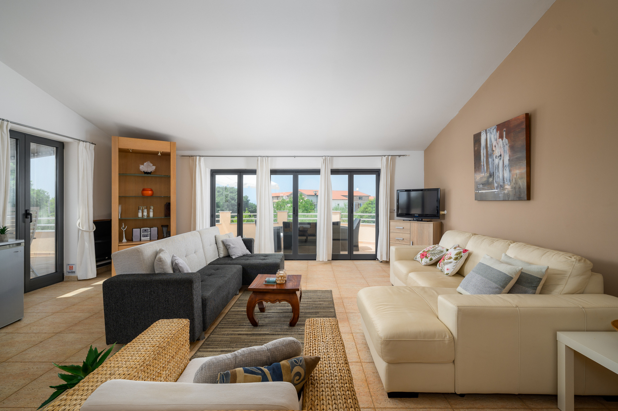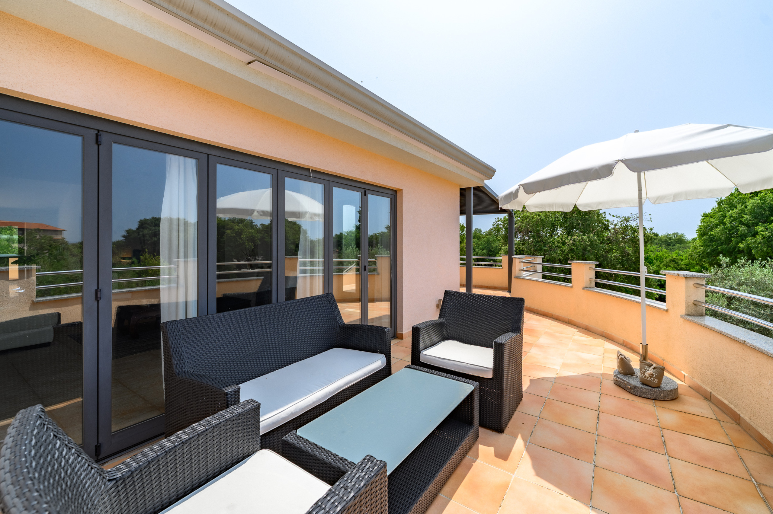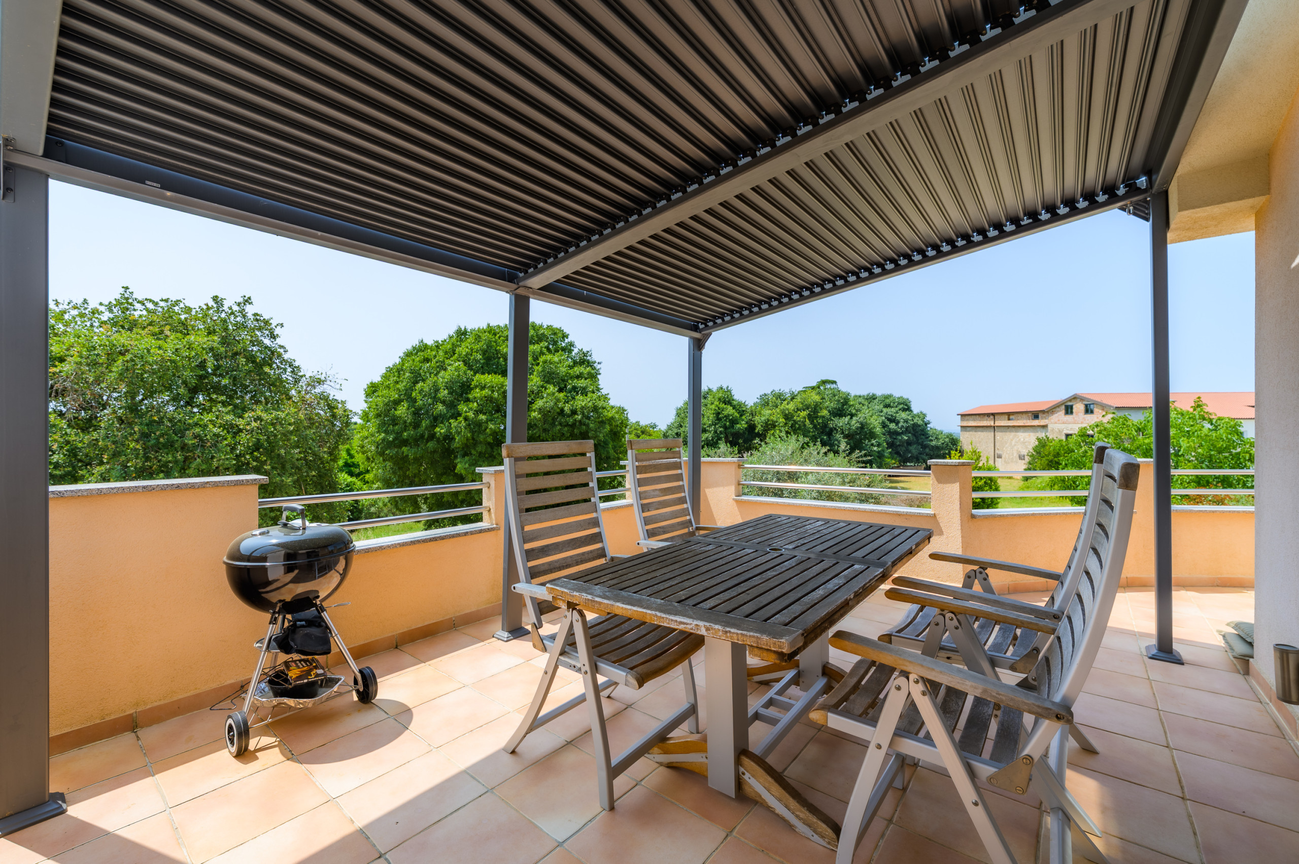 Davanti all'appartamento c'è un ampio terrazzo coperto, perfetto per rilassarsi nel sahe. Il giardino antistante è di pertinenza dell'appartamento e lateralmente si trova una parte di giardino con piscina in comune. La piscina è condivisa con l'appartamento Panous II che si trova dall'altra parte dell'edificio.