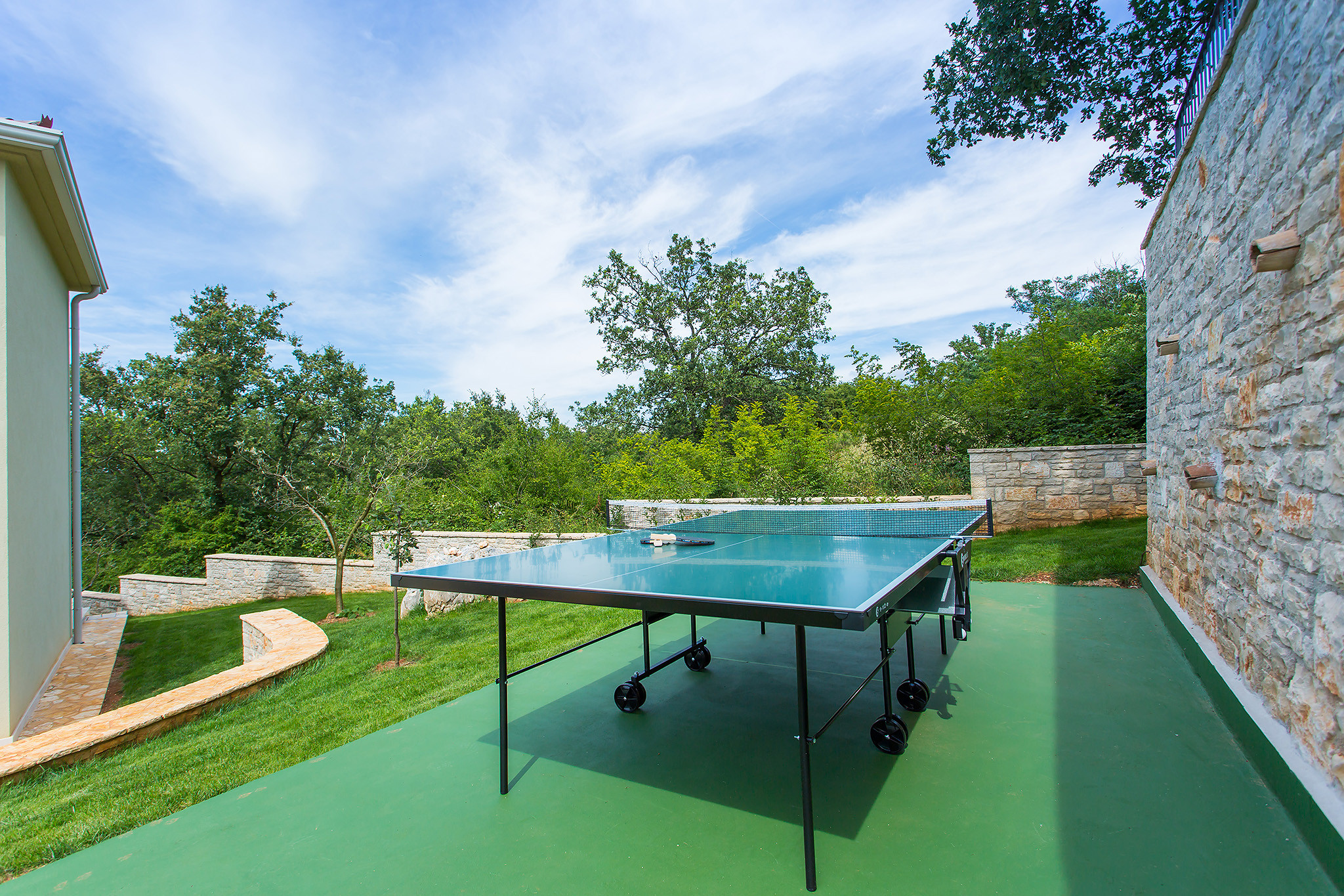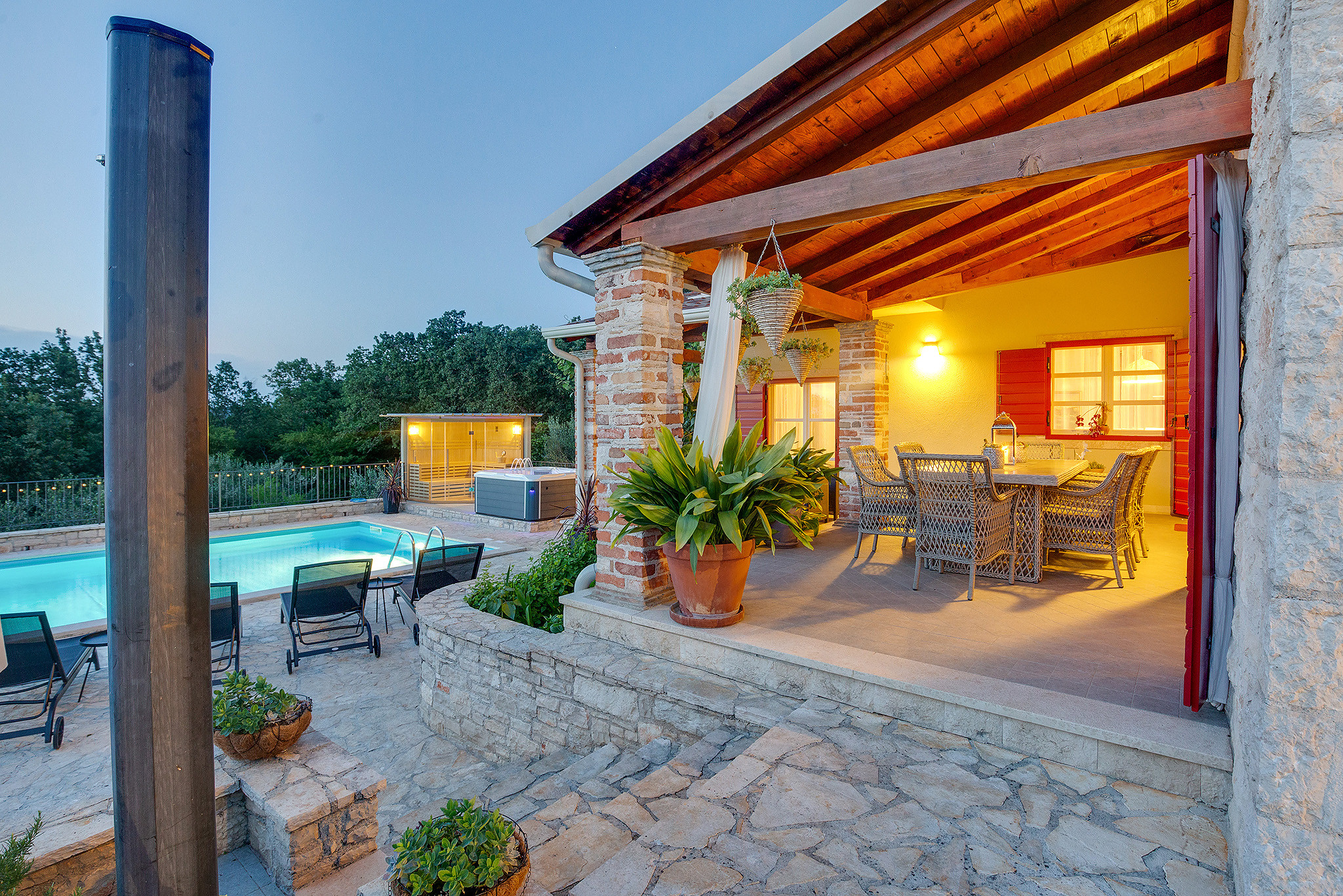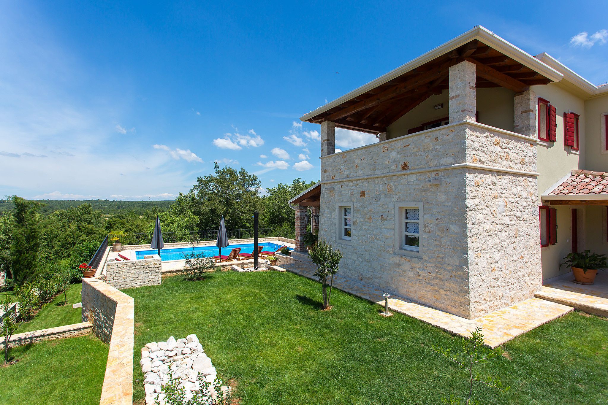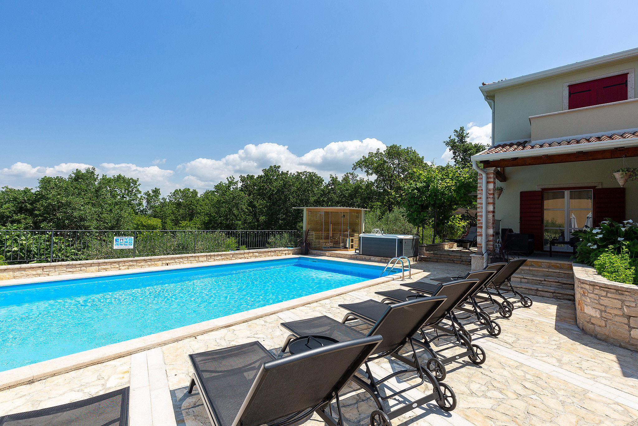 La grande piscina privata e il giardino curato sono perfetti per rilassarsi nel cuore della bellezza naturale dell'Istria. La terrazza coperta invita a gustare pasti all'aperto e momenti di pace nella fresca aria mediterranea.