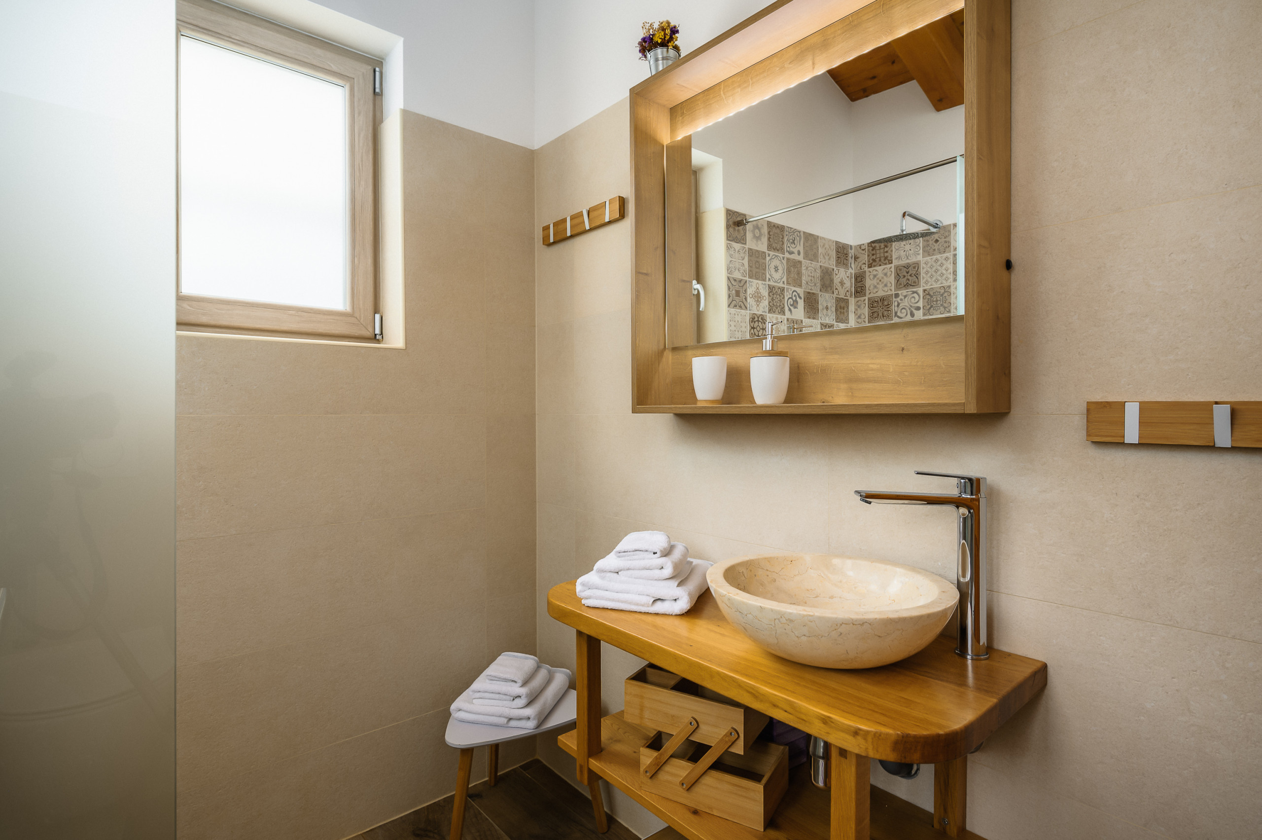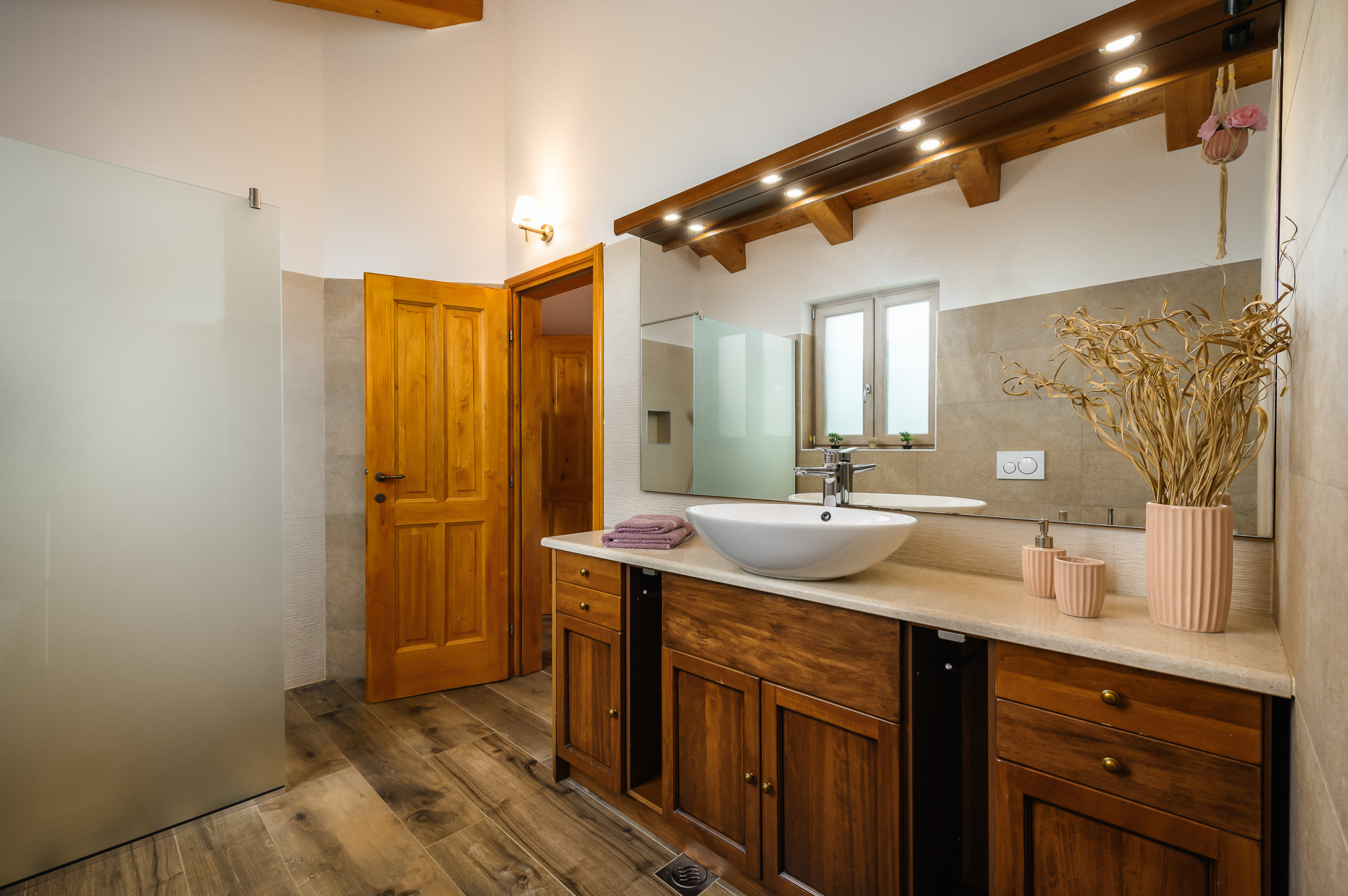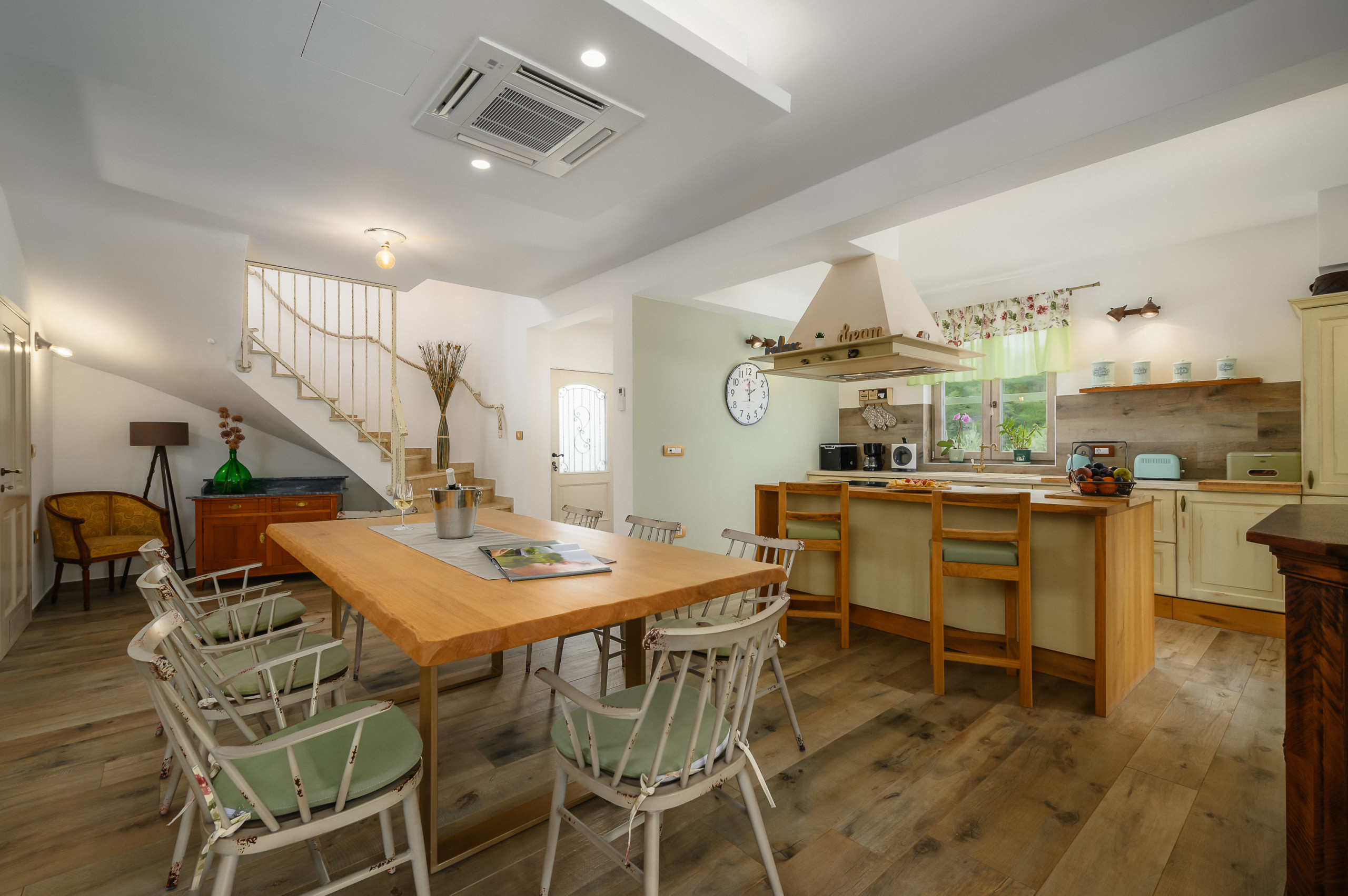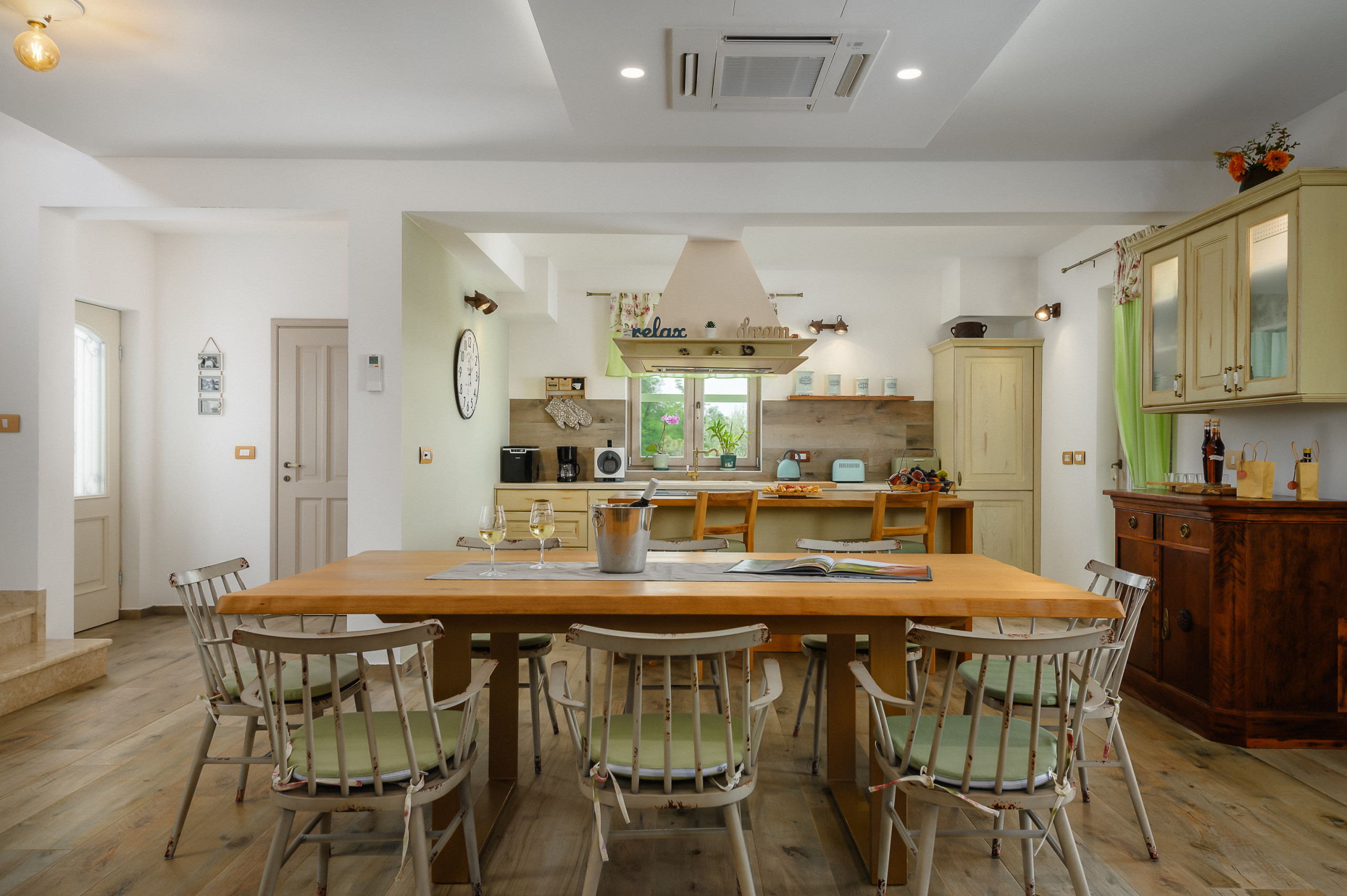 All'interno, la villa offre un'atmosfera calda e accogliente con un piano terra splendidamente arredato che include una cucina, zona pranzo e soggiorno. La cucina completamente attrezzata, in stile country moderno, si integra perfettamente con la zona pranzo, mentre il soggiorno ti invita a rilassarti sul divano davanti al camino nei giorni più freddi.