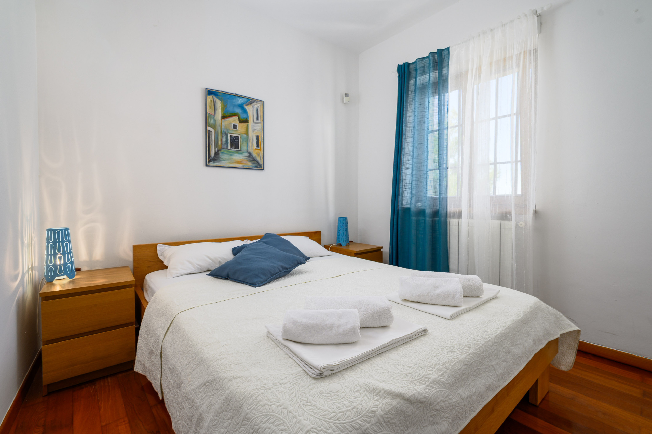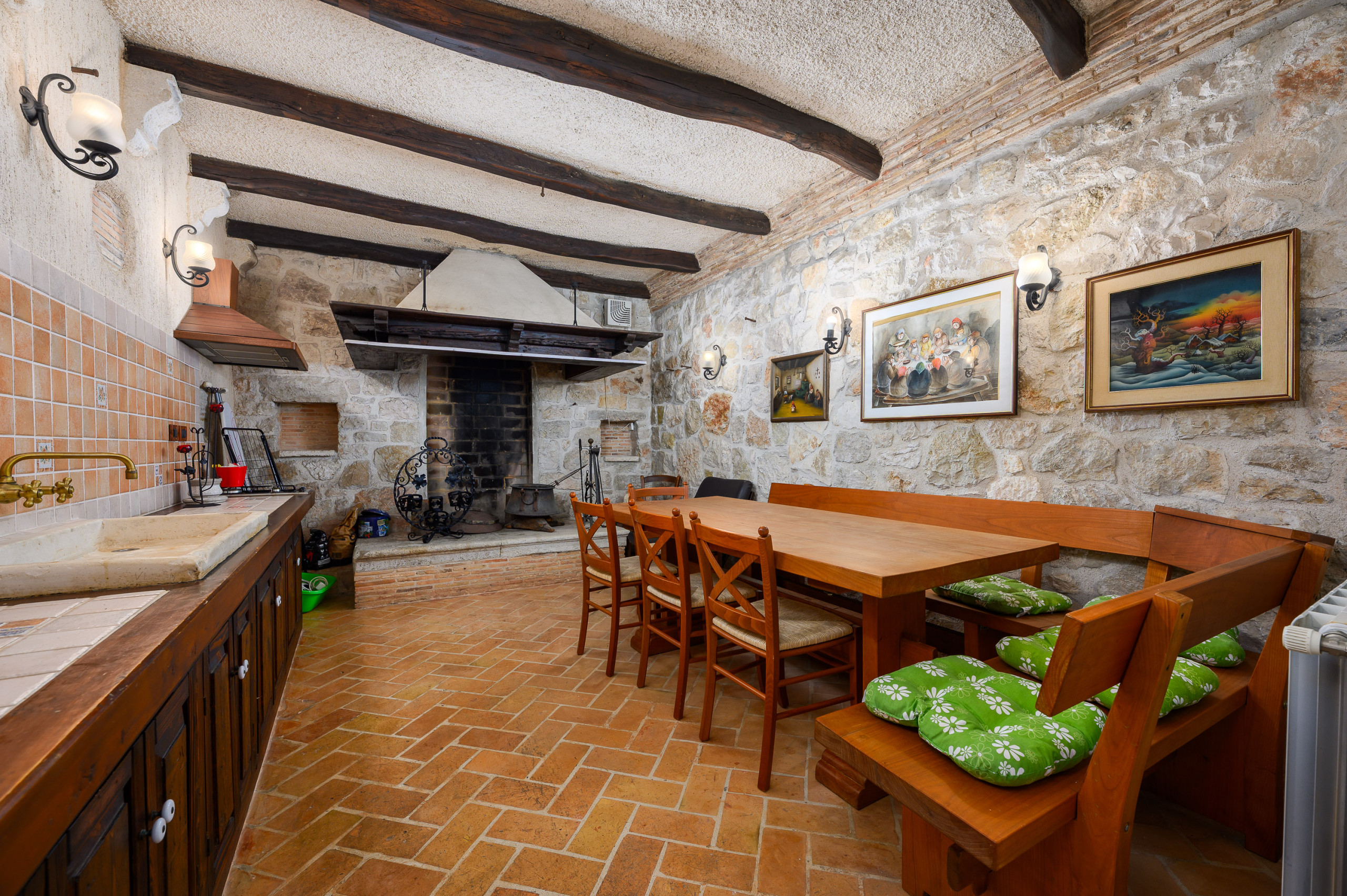 Al piano superiore, il primo piano ospita un'ampia zona giorno open space con un altro camino e una cucina completamente attrezzata. Ampie finestre inondano lo spazio di luce naturale e si aprono su una magnifica vista sul mare e sull'arcipelago di Orsera. Il soggiorno è climatizzato e include un divano letto estraibile, che offre ulteriore spazio per due persone.